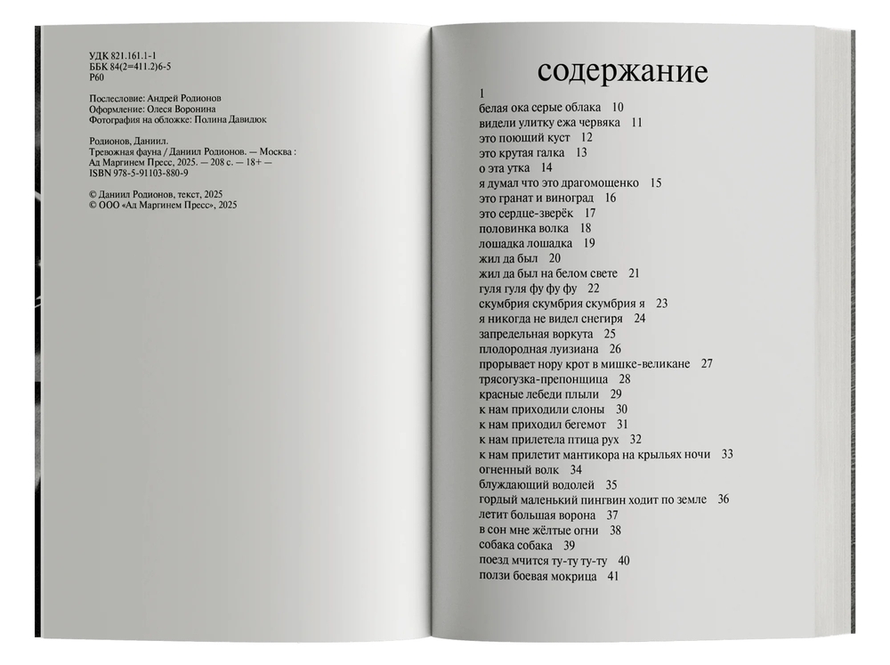 "Тревожная фауна" – дебютный сборник Даниила Родионова (род. 1989), участника и победителя нескольких поэтических слэмов.