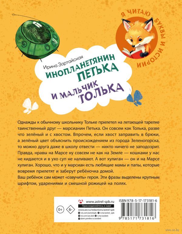 Однажды к обычному школьнику Тольке прилетел на летающей тарелке таинственный друг – марсианин Петька. Он совсем как Толька, разве что зелёный и с хвостом. Впрочем, если хвост заправить в брюки, а зелёный цвет объяснить происхождением из города Зеленогорска, то можно друга даже в школу отвести – никто ничего не заподозрит. Правда, нравы на Марсе ну совсем не как на Земле – кошками у нас не кидаются и в ухо суп не наливают. А вот хулиган – он и на Марсе хулиган. Хорошо, что и у марсиан есть любящие мамы и папы, которые вовремя прилетят и заберут ребёночка домой.