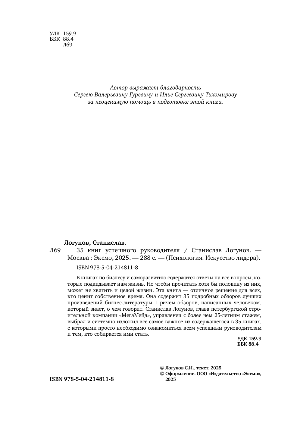 В книгах по бизнесу и саморазвитию содержатся ответы на все вопросы, которые подкидывает нам жизнь. Но чтобы прочитать хотя бы половину из них, может не хватить и целой жизни. Эта книга – отличное решение для всех, кто ценит собственное время. Она содержит 35 подробных обзоров лучших произведений бизнес-литературы. Причем обзоров, написанных человеком, который знает, о чем говорит. Станислав Логунов, глава петербургской строительной компании "МегаМейд", управленец с более чем 25-летним стажем, выбрал и системно изложил все самое важное из содержащегося в 35 книгах, с которыми просто необходимо ознакомиться всем успешным руководителям и тем, кто собирается ими стать.