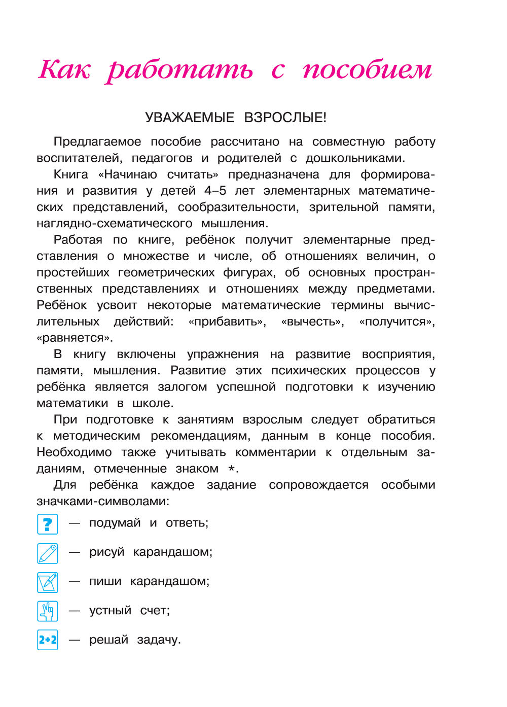 Выполняя интересные игровые задания, ребенок познакомится с числами первого десятка, понятиями "больше", "меньше", "равно", порядковым счетом, научится сравнивать предметы по количеству, писать цифры, решать примеры на сложение и вычитание с помощью числовой прямой. Знания, умения и навыки, которые дошкольник приобретет в результате занятий, позволят ему почувствовать уверенность в себе и в дальнейшем их успешно использовать. Кроме того, в пособии приведены методические рекомендации, которые подскажут, как правильно организовать занятия с ребенком.