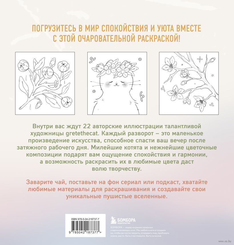 Откройте для себя пушистые вселенные с этой раскраской. Внутри читателя ожидают 22 авторские иллюстрации художницы gretethecat, где пушистые котята живут среди цветочных грёз. Каждая страница – словно тихий вечер после долгого дня, наполненный теплом, нежностью и уютом. Заварите чай, поставьте на фон сериал или подкаст, хватайте любимые материалы для раскрашивания и создайте свои уникальные пушистые вселенные.
