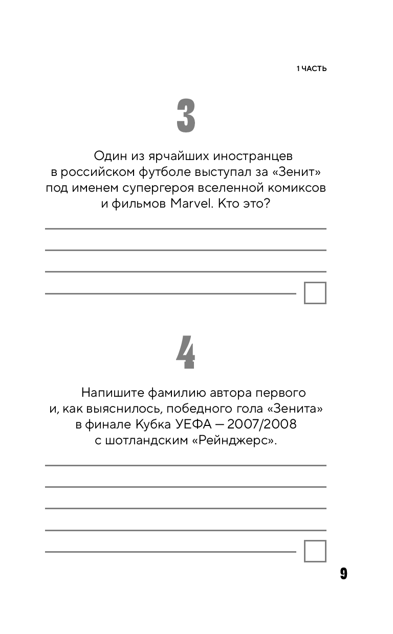 Каждый вопрос – это частица великой истории "Зенита", полной страсти, триумфов и незабываемых матчей! Эта книга-квиз – твой шанс доказать, что сине-бело-голубые цвета всегда в твоем сердце.