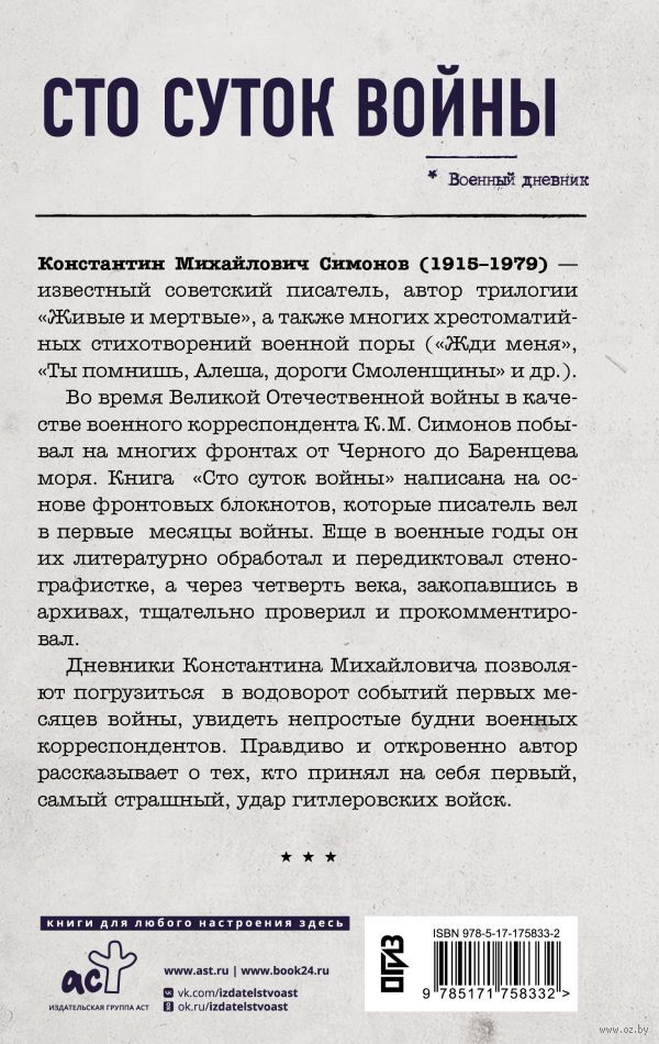 Во время Великой Отечественной войны в качестве военного корреспондента К.М. Симонов побывал на многих фронтах от Черного до Баренцева моря. Книга "Сто суток войны" написана на основе фронтовых блокнотов, которые писатель вел в первые месяцы войны. Еще в военные годы он их литературно обработал и передиктовал стенографистке, а через четверть века, закопавшись в архивах, тщательно проверил и прокомментировал.