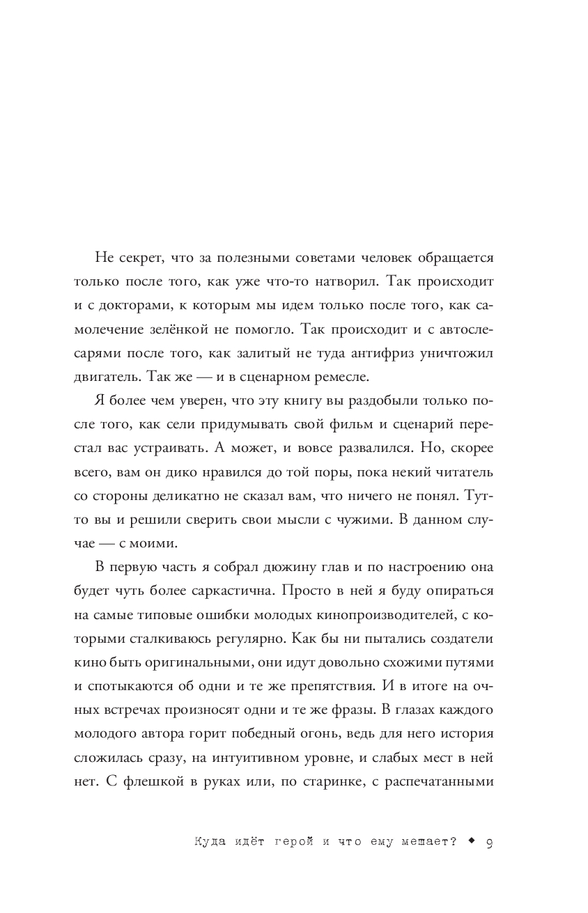 Книга разделена на две смысловые части: первая – это ироничный разбор ошибок тех, кто уже написал свой сценарий, но почувствовал его несовершенство. Вторая часть предлагает конкретные советы тем, кто ещё только садится писать свою историю.