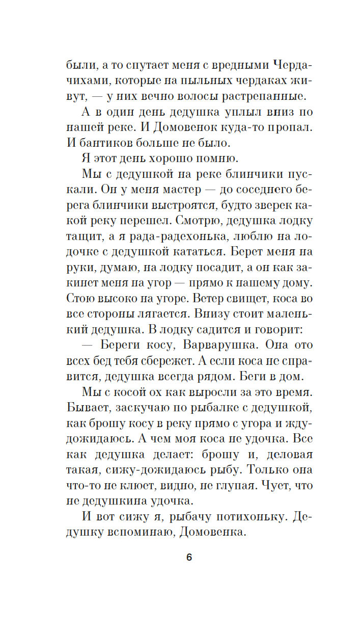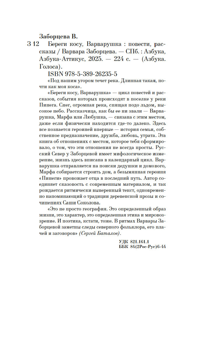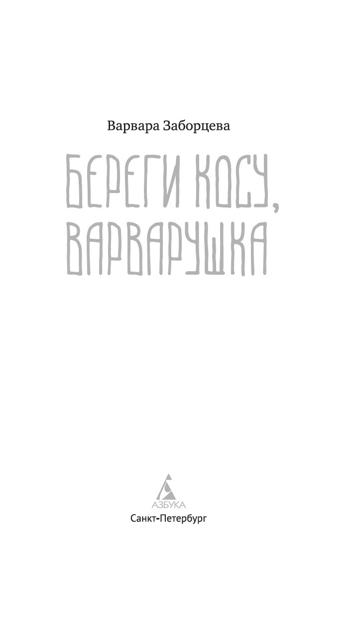 "Береги косу, Варварушка" – цикл повестей и рассказов, события которых происходят в поселке у реки Пинега. Снег, огромная река, спящая подо льдом, высокое небо. Рассказчица, как бы ее ни звали – Варварушка, Марфа или Любушка, – связана с этим местом, даже если физически находится где-то далеко. Здесь все познается героиней впервые – история семьи, собственное предназначение, дружба, любовь, утрата. Эта книга об отношениях с местом, которое тебя сформировало, о том, что эти отношения не всегда просты. Русский Север у Заборцевой имеет мифологическое измерение, жизнь здесь вписана в календарный цикл. Варварушка отправляется на поиски дедушки и домового, Марфа собирается строить дом, а безымянная героиня "Пинеги" провожает отца в последний путь. Автор соединяет сказовость с современным материалом, и так рождается ритмически выверенный текст, одновременно напоминающий о традиции деревенской прозы и сочинениях Саши Соколова.