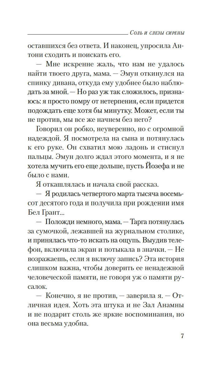 Юной русалке Тарге, могущественному водному элементалю, обитательнице морских глубин и одновременно наследной владелице польской "Судоходной компании Новаков", предстоит однажды вечером выслушать мамину историю о русалочке по имени Бел, которая, повзрослев, обрела свое истинное имя Сибеллен. Ей довелось совершить множество путешествий, выйти замуж и родить сыновей, чтобы потом лишиться их, взойти на престол царства сирен Океаноса, полюбить атланта и, наконец, попытаться положить конец бессмысленной вражде двух подводных народов. Но какое отношение все это имеет к Тарге? Ответ оказывается настолько невероятным, что девушка не в силах в него поверить. Однако ей ничего не остается, как принять реальность и действовать, исходя из обстоятельств…