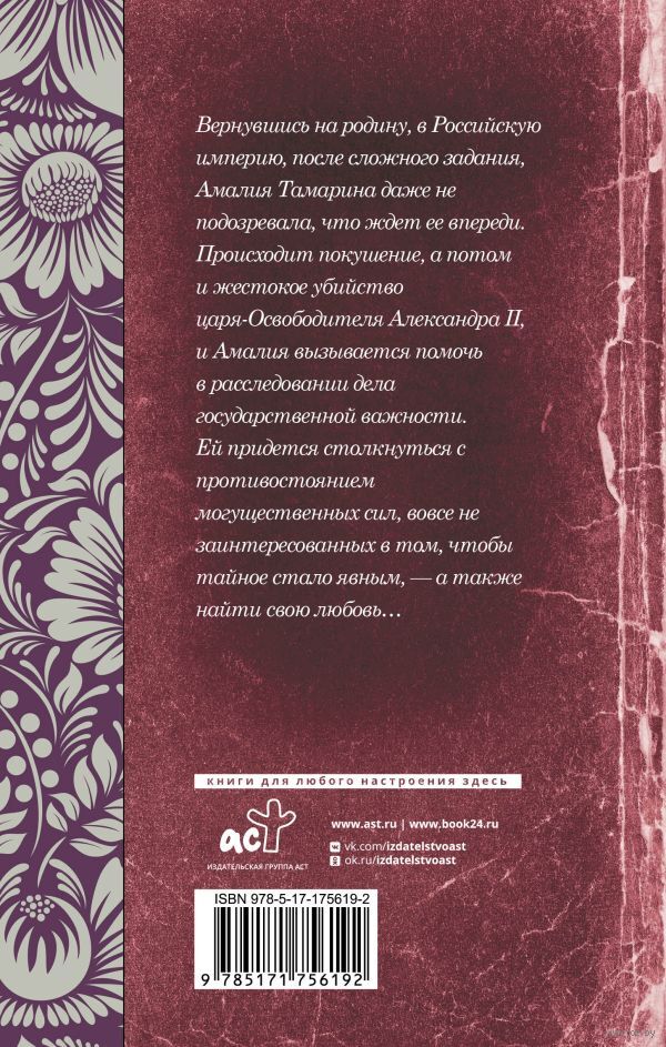 Вернувшись на родину, в Российскую империю после сложного задания, Амалия Тамарина даже не подозревала, что ждет ее впереди. Происходит покушение, а потом и жестокое убийство царя- Освободителя Александра II, и Амалия вызывается помочь в расследовании дела государственной важности. Ей придется столкнуться с противостоянием могущественных сил, вовсе не заинтересованных в том, чтобы тайное стало явным – а также найти свою любовь…