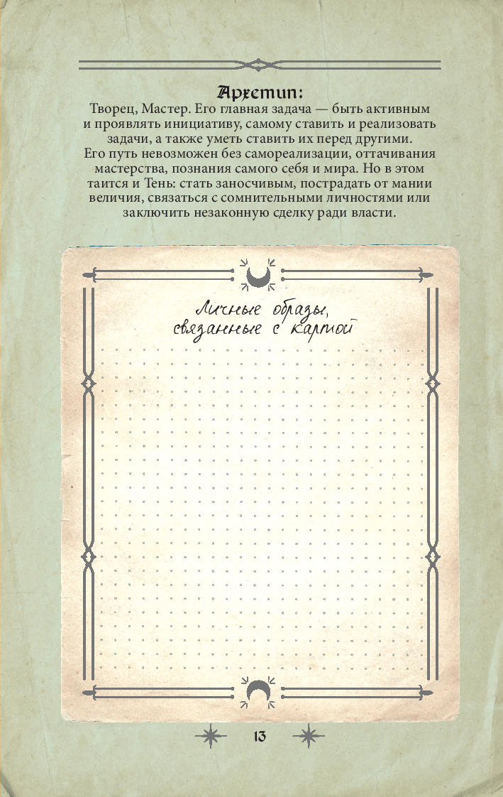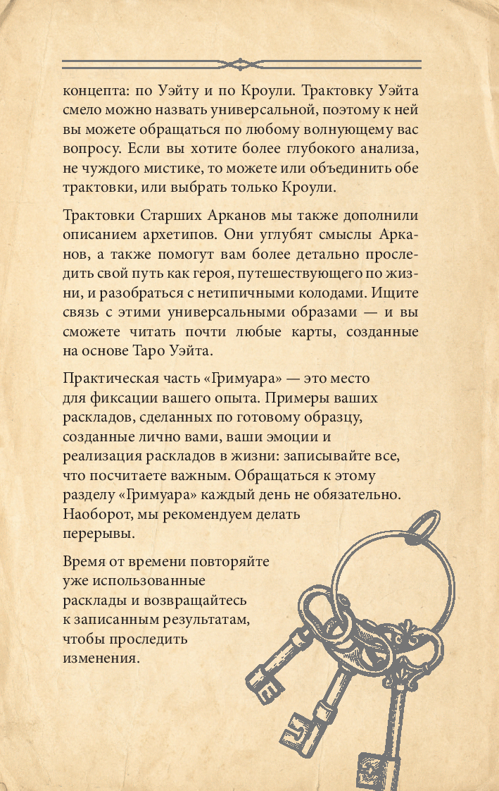 На страницах вы найдете описания карт и архетипов по двум основным системам: Уэйта и Кроули, а также специально отведенные места для записи личных интерпретаций, ассоциаций и размышлений. Здесь вы сможете фиксировать свои наблюдения, создавать уникальные расклады и отслеживать прогресс в восприятии карт.