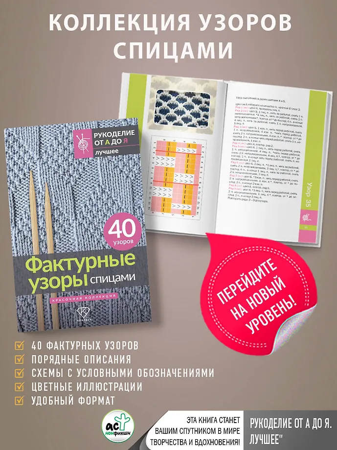 Спицы – волшебный инструмент, с помощью которого можно превратить простую нить в изысканное полотно. В этой книге представлена красочная коллекция из 40 ярких и фактурных узоров, в которых сочетаются выразительные рельефы, геометрия и игра текстур. Эти узоры прекрасно подойдут для свитеров, пледов, аксессуаров и даже интерьерного декора. Каждый узор сопровождает фотография, схема и пошаговое описание по рядам – все, чтобы вязание было понятным и увлекательным. Создайте красивые вещи своими руками – и пусть эта книга станет вашим спутником в мире творчества и вдохновения!