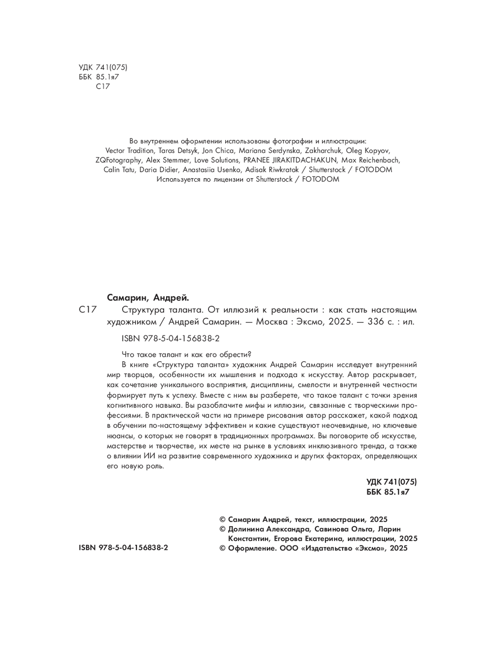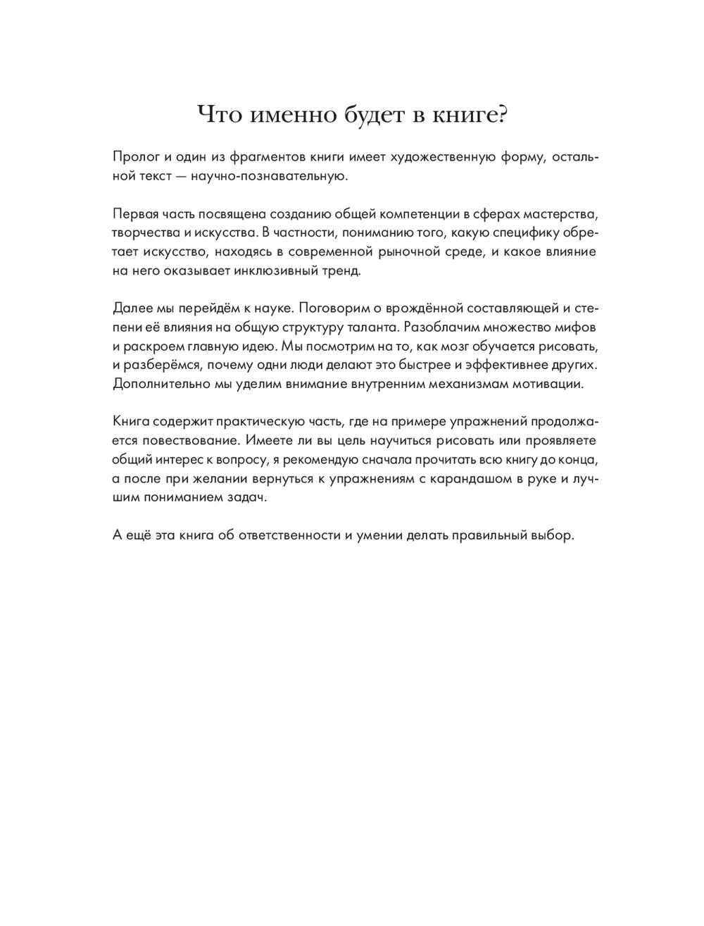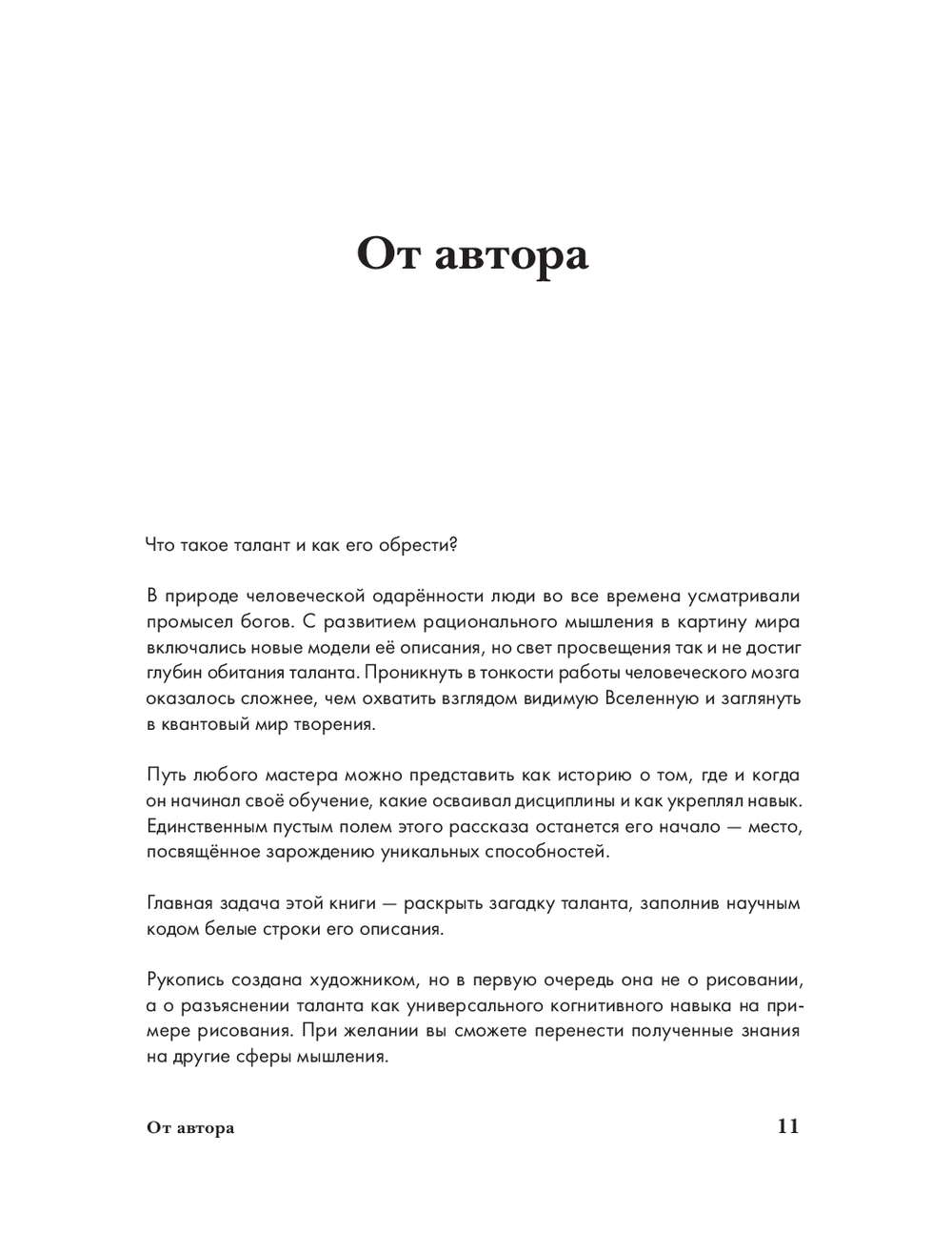 Что такое талант и как его обрести? В книге "Структура таланта" художник Андрей Самарин исследует внутренний мир творцов, особенности их мышления и подхода к искусству. Автор раскрывает, как сочетание уникального восприятия, дисциплины, смелости и внутренней честности формирует путь к успеху. Вместе с ним вы разберете, что такое талант, с точки зрения когнитивного навыка. Вы разоблачите мифы и иллюзии, связанные с творческими профессиями. В практической части на примере рисования автор расскажет, какой подход в обучении по-настоящему эффективен и какие существуют неочевидные, но ключевые нюансы, о которых не говорят в традиционных программах. Вы поговорите об искусстве, мастерстве и творчестве, их месте на рынке в условиях инклюзивного тренда, а также о влиянии ИИ на развитие современного художника и других факторах, определяющих его новую роль.