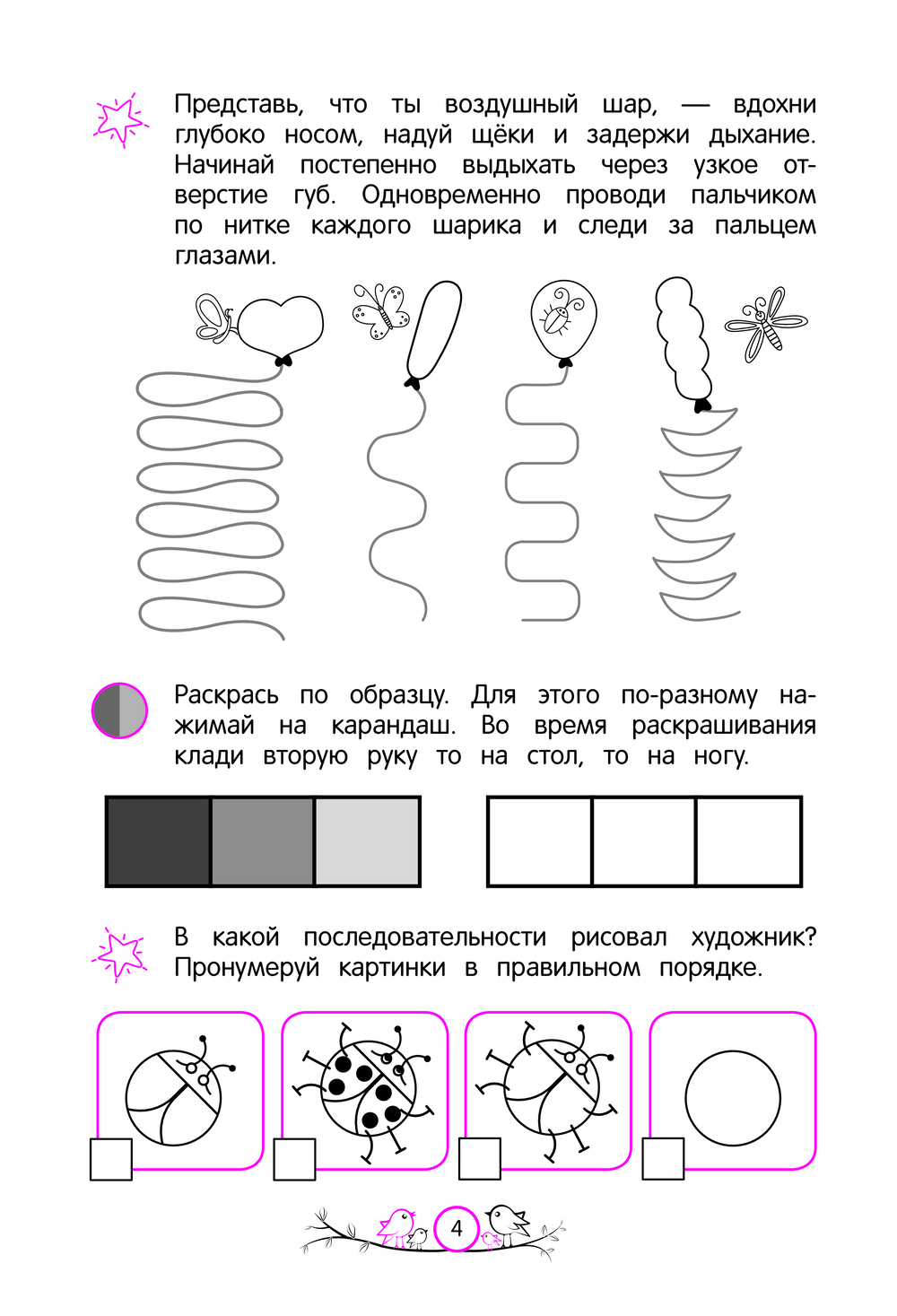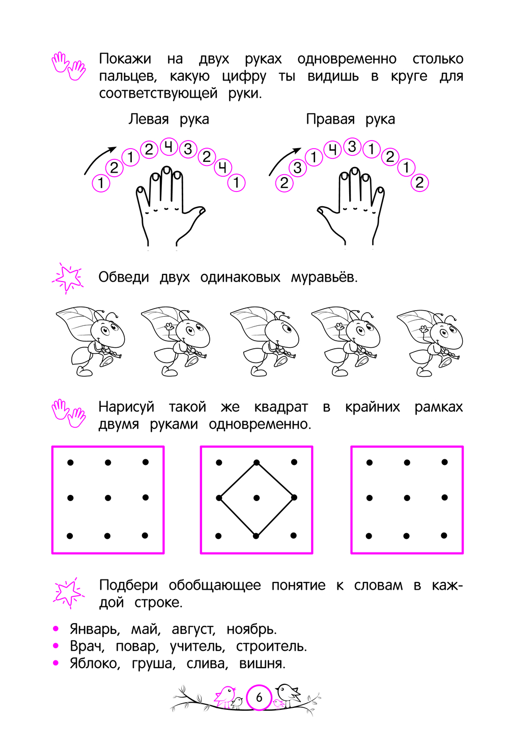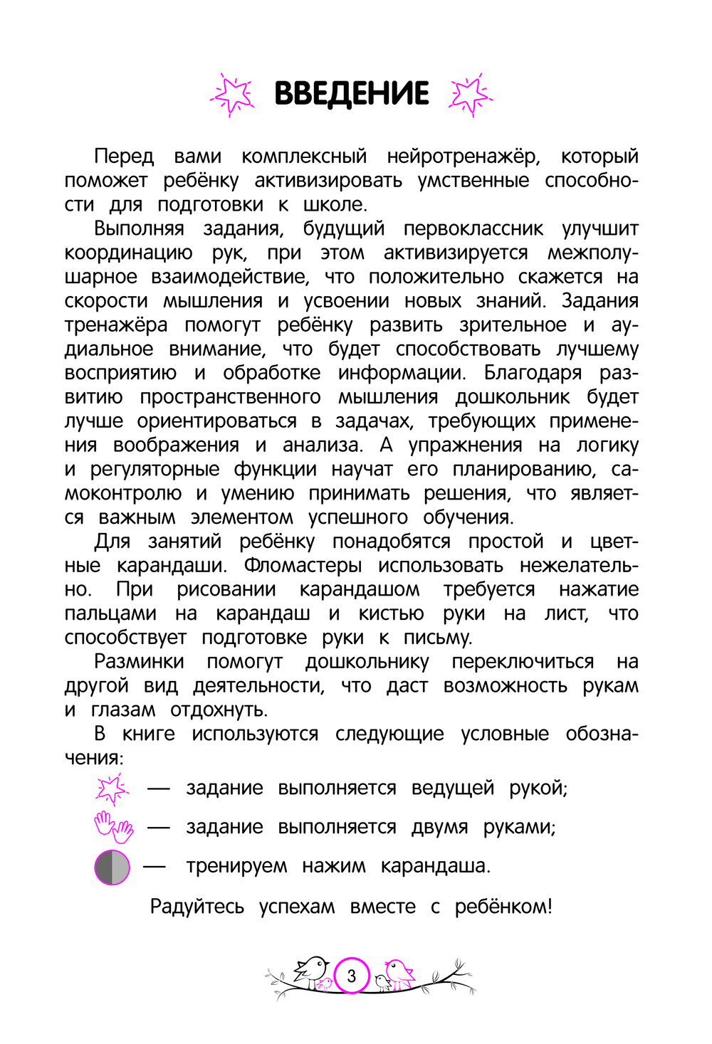 В книге использован нейропсихологический метод с элементами игры, как ведущего вида деятельности дошкольника. Занимаясь, ребенок будет выполнять увлекательные задания на логику и память, обводит линии двумя руками одновременно, искать лишнее, дорисовывать по условию и рисовать по точкам, находить спрятанные на картинке предметы, подбирать подходящие силуэты, определять закономерности и продолжать последовательности. Все это является важными элементами подготовки к школе.