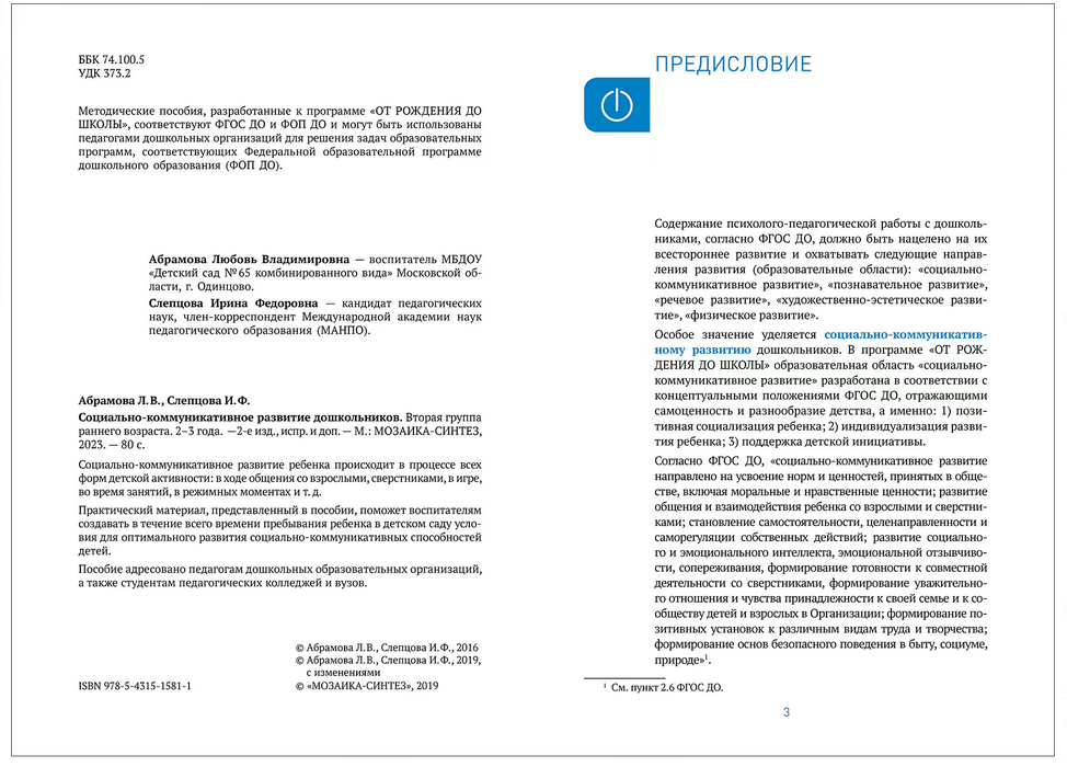Пособие посвящено социально коммуникативному развитию детей 2-3 лет. В нем содержится практический материал, который поможет педагогам организовать совместную деятельность с детьми с учетом концептуальных положений и принципов ФГОС ДО: индивидуализация, социализация, интеграция, вариативность. Методические материалы носят практико-ориентированный характер и могут использоваться в повседневной работе с детьми в детском саду.