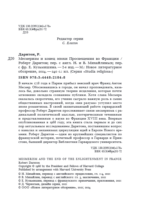 Хотя слава Месмера оказалась скоротечна, его учение сыграло важную роль в смене общественных настроений, когда "век разума" уступил место эпохе романтизма. В своей захватывающей работе гарвардский профессор Роберт Дарнтон прослеживает связи месмеризма с радикальной политической мыслью, эзотерическими течениями и представлениями о науке во Франции XVIII века.