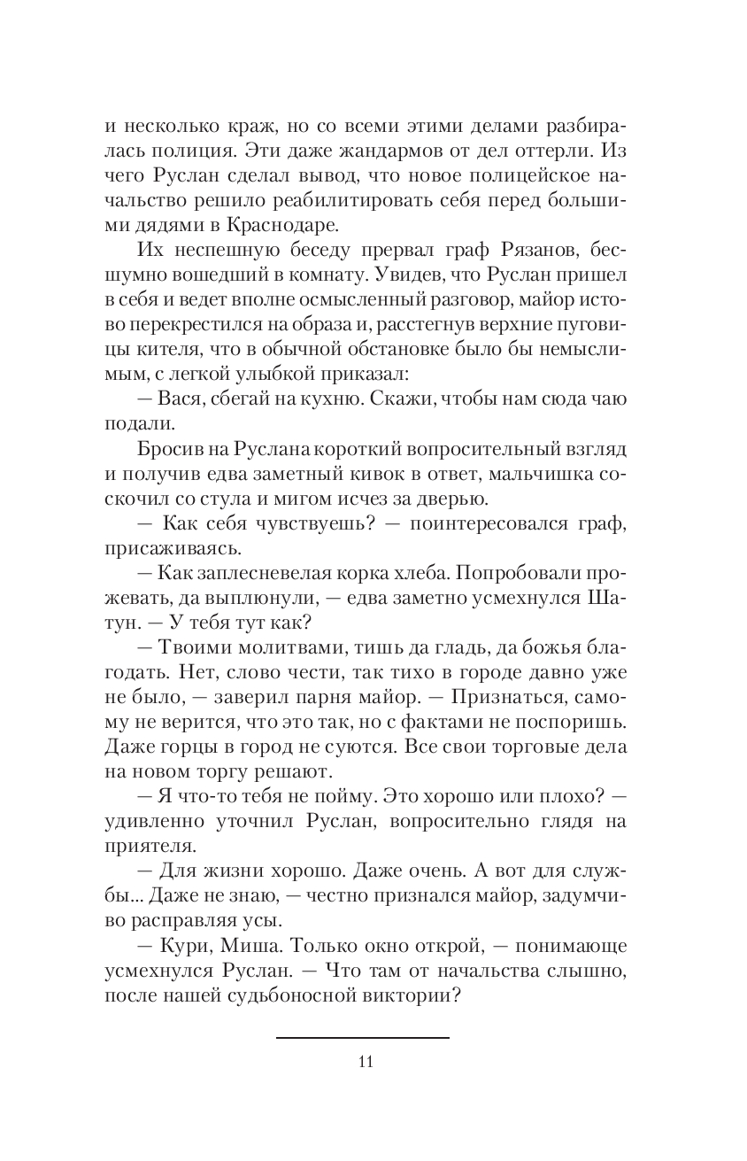 Руслан всегда знал, что чем больше у человека власти, тем больше ему её хочется. Так было всегда, так случилось и теперь. Они честно тянули свою лямку, рискуя жизнями и здоровьем, но кому-то там, наверху, это показалось не столь важным. Но нашлись и те, кому покой государства важнее, чем личная выгода. Так что, получив отставку в имперской службе, они, сами того не ожидая, стали контрразведкой казачьего воинства. А следовательно, Шатун теперь казачий князь…
