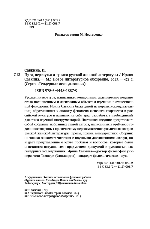 Настоящее издание представляет собой собрание избранных статей автора, написанных в 1998–2020 годах и посвященных критическому переосмыслению различных жанров русской женской литературы: прозы, поэзии, мемуаристики.