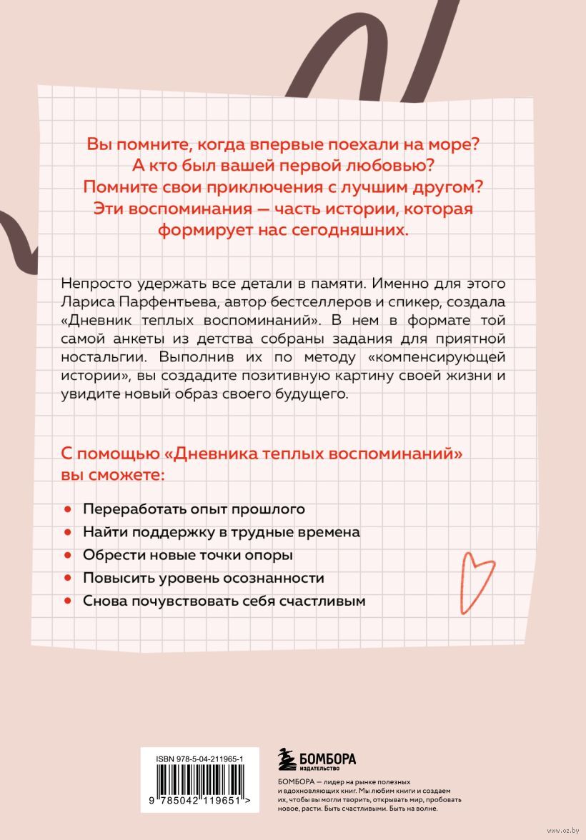 Не просто удержать все детали в памяти. Именно для этого Лариса Парфентьева, автор бестселлеров и спикер, создала "Дневник теплых воспоминаний". В нем в формате той самой анкеты из детства собраны задания для приятной ностальгии. Выполнив их по методу "компенсирующей истории", вы создадите позитивную картину своей жизни и увидите новый образ своего будущего.