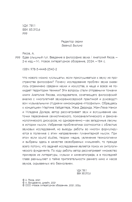 Эти вопросы стали отправными точками книги Анатолия Рясова, исследователя, сочетающего философский анализ с многолетней звукорежиссерской практикой и руководством музыкальными студиями киноконцерна "Мосфильм".