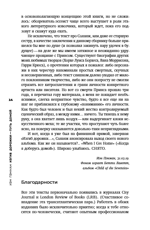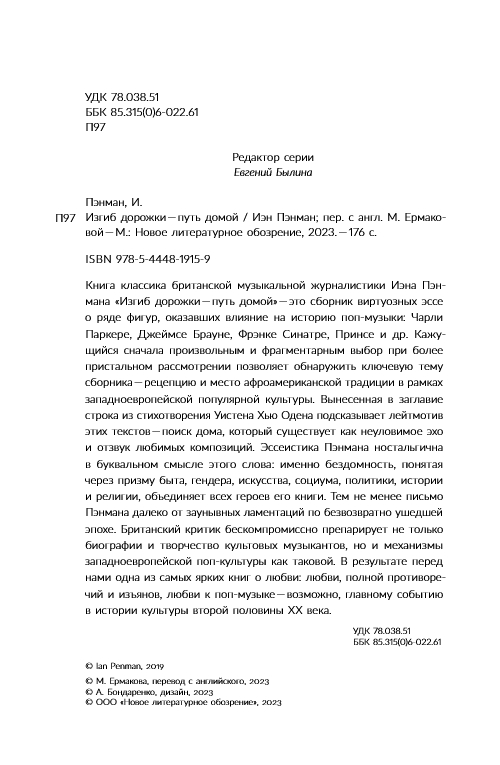 Книга классика британской музыкальной журналистики Иэна Пэнмана "Изгиб дорожки – путь домой" – это сборник виртуозных эссе о ряде фигур, оказавших влияние на историю поп-музыки: Чарли Паркере, Джеймсе Брауне, Фрэнке Синатре, Принсе и др.