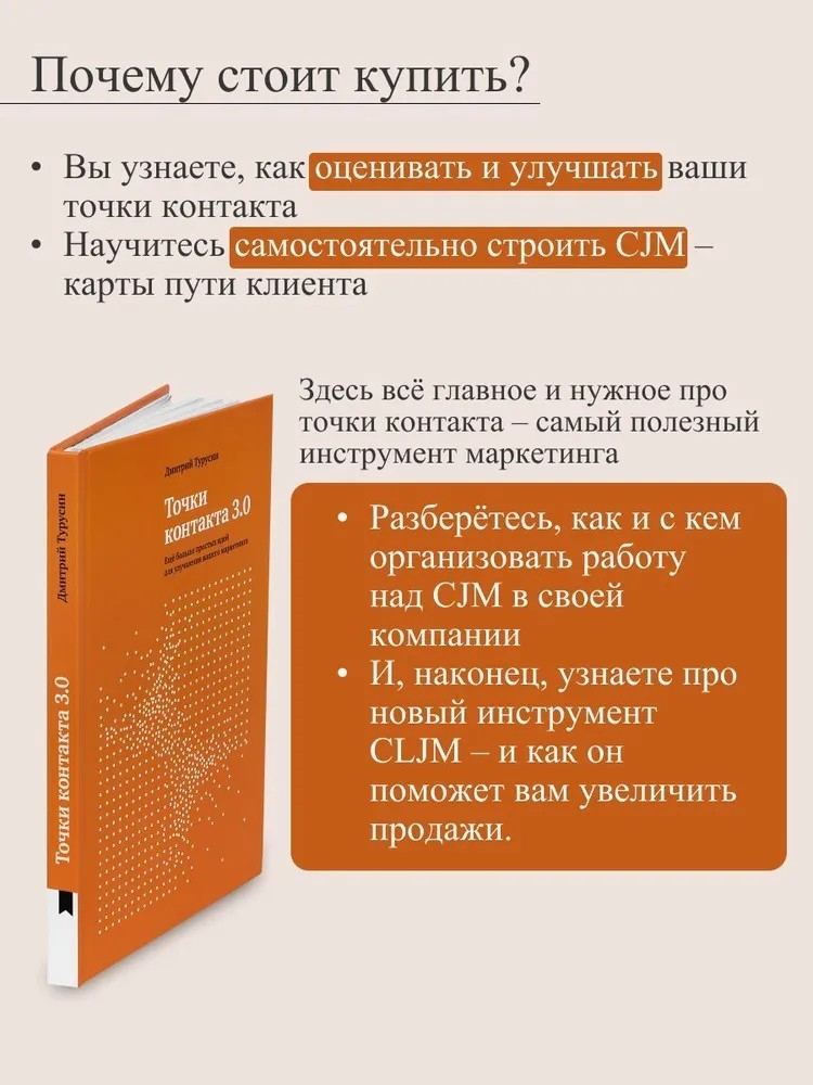 Новая книга Дмитрия Турусина объединяет уже три инструмента: точки контакта, карты пути клиента (CJM) и карты жизненного пути клиента (CLJM). Каждый из них – это продолжение, развитие предыдущего.