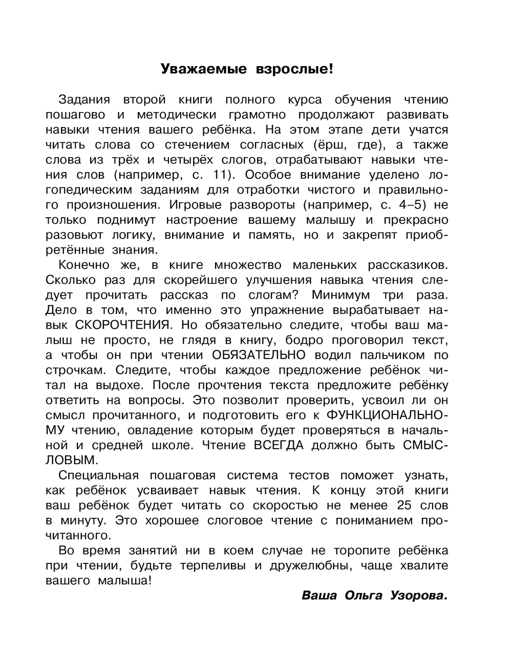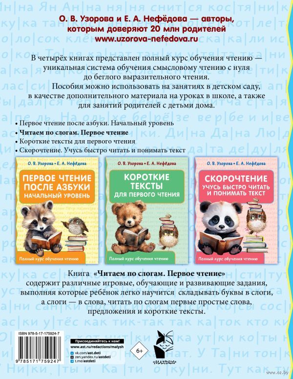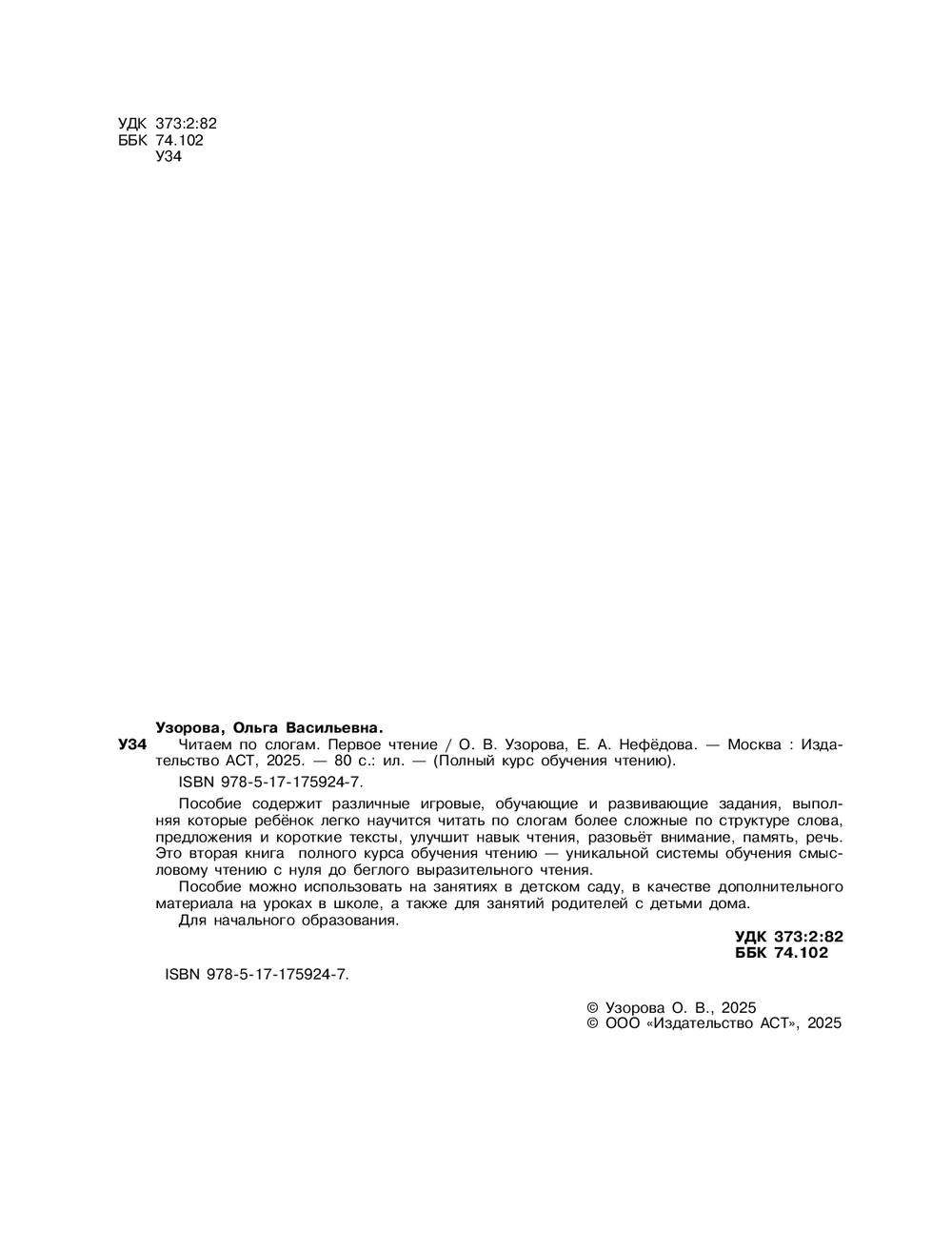 Пособие "Первая книга чтения по слогам" содержит различные игровые, обучающие и развивающие задания, выполняя которые ребёнок легко научится читать по слогам более сложные по структуре слова, предложения и короткие тексты, улучшит навык чтения, разовьёт внимание, память, речь. Это вторая книга полного курса обучения чтению – уникальной системы обучения смысловому чтению с нуля до беглого выразительного чтения.