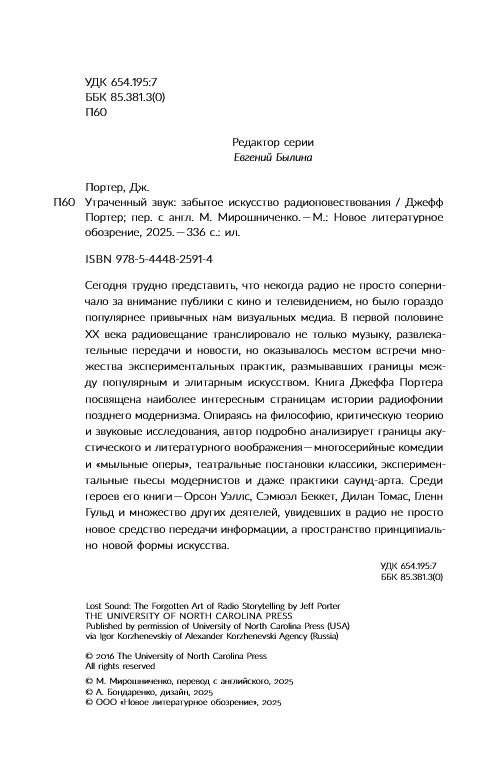 Книга Джеффа Портера посвящена наиболее интересным страницам истории радиофонии позднего модернизма. Опираясь на философию, критическую теорию и звуковые исследования, автор подробно анализирует границы акустического и литературного воображения – многосерийные комедии и "мыльные оперы", театральные постановки классики, экспериментальные пьесы модернистов и даже практики саунд-арта.