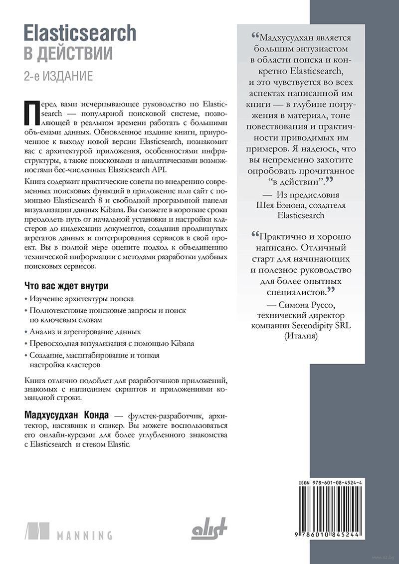 Исчерпывающее руководство по Elasticsearch – популярной поисковой системе, позволяющей в реальном времени работать с большими объемами данных. Книга содержит практические советы по внедрению современных поисковых функций в приложение или сайт с помощью Elasticsearch 8 и свободной программной панели визуализации данных Kibana. Подробно описаны процессы индексации данных, поиск по полнотекстовым запросам, работа с запросами на уровне терминов и составных запросов, а также анализа и агрегации данных. Книга также затрагивает архитектуру Elasticsearch, механизмы маппинга данных, работу с документами, операции индексации, визуализацию с помощью Kibana, создание кластеров и многие другие аспекты. Это исчерпывающее пособие для тех, кто хочет глубоко погрузиться в мир поисковых систем и использовать Elasticsearch в своих проектах.
