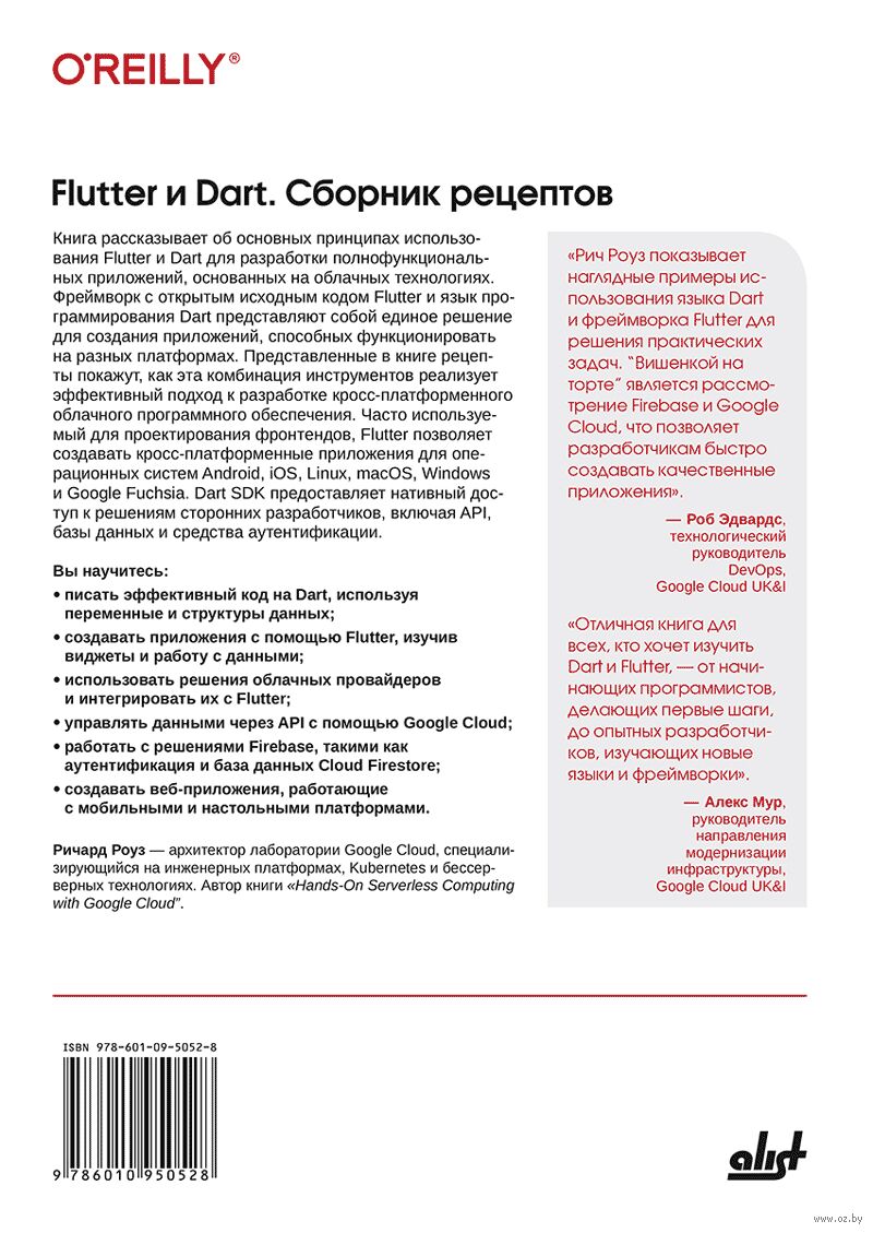 Книга посвящена практическому применению фреймворка Flutter и языка программирования Dart. Показан синтаксис Dart, описаны основные структуры языка. Раскрыты принципы создания мобильных и настольных приложений с использованием Flutter для операционных систем Android, iOS, Linux, macOS, Windows и Google Fuchsia. Рассказано о работе с данными и виджетами, об использовании различных решений облачных провайдеров и интегрирации их с приложениями на Flutter. Рассмотрено управление данными через API с помощью Google Cloud. Представлены приемы работы с решениями Firebase, такими как аутентификация и база данных Cloud Firestore.