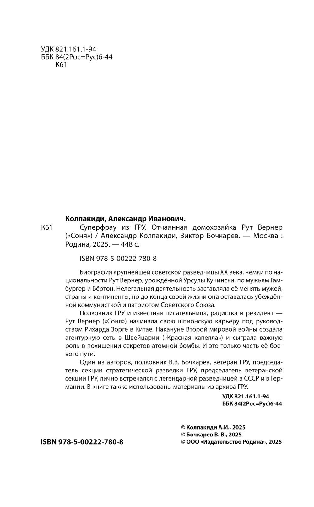 Один из авторов, полковник В.В. Бочкарев, ветеран ГРУ, председатель секции стратегической разведки ГРУ, председатель ветеранской секции ГРУ лично встречался с легендарной разведчицей в СССР и в Германии. В книге также использованы материалы из архива ГРУ.