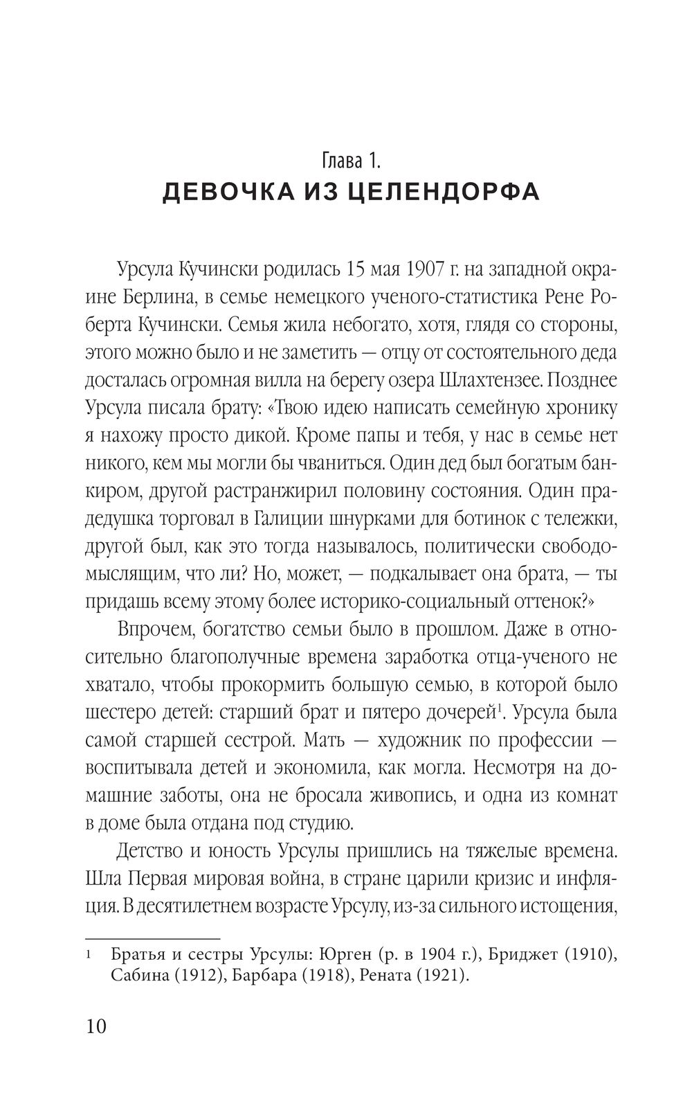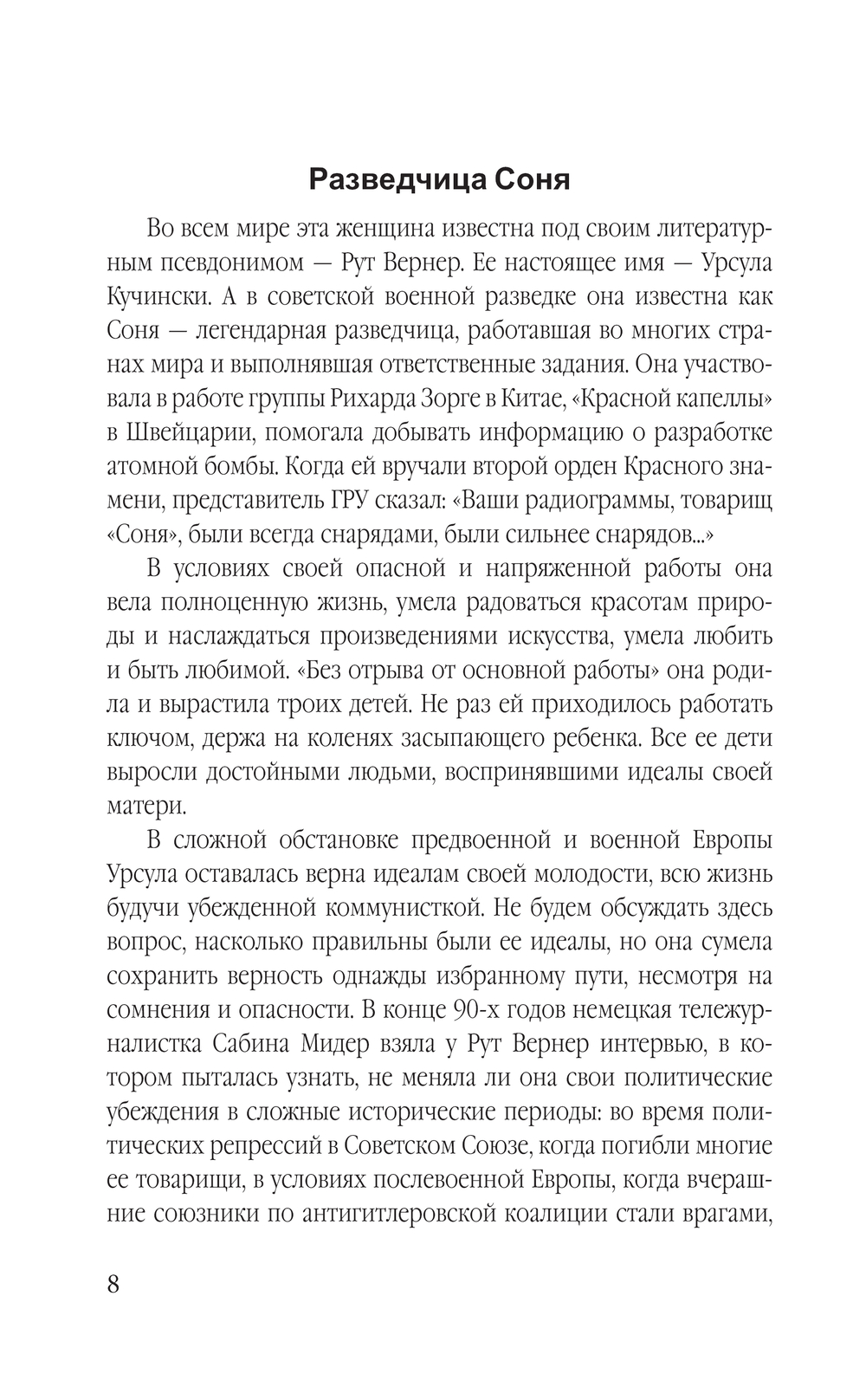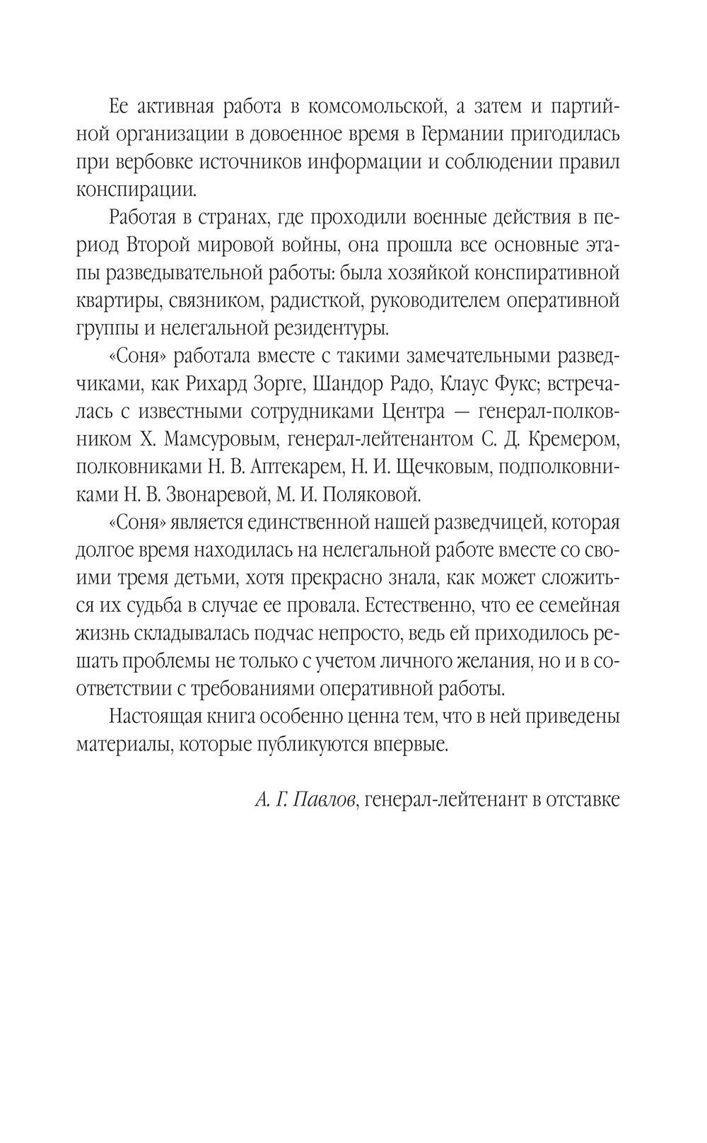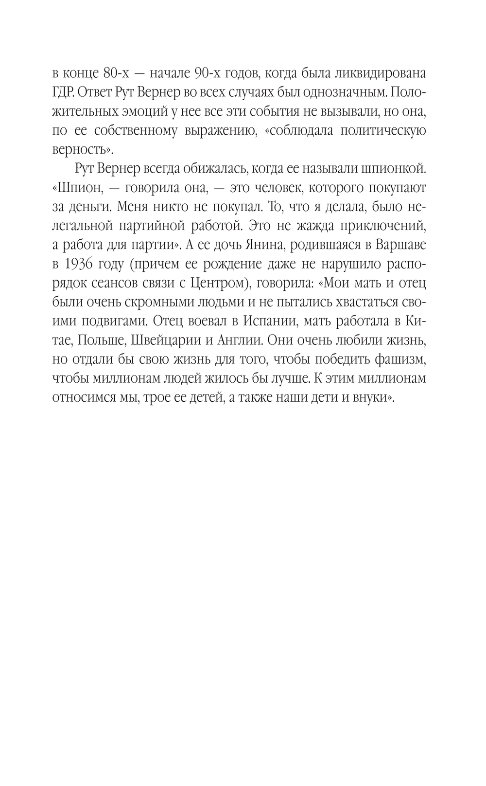 Биография крупнейшей советской разведчицы ХХ века, немки по национальности Рут Вернер, урождённой Урсулы Кучински, по мужьям Гамбургер и Бёртон. Нелегальная деятельность заставляла её менять мужей, страны и континенты, но до конца своей жизни она оставалась убеждённой коммунисткой и патриотом Советского Союза.