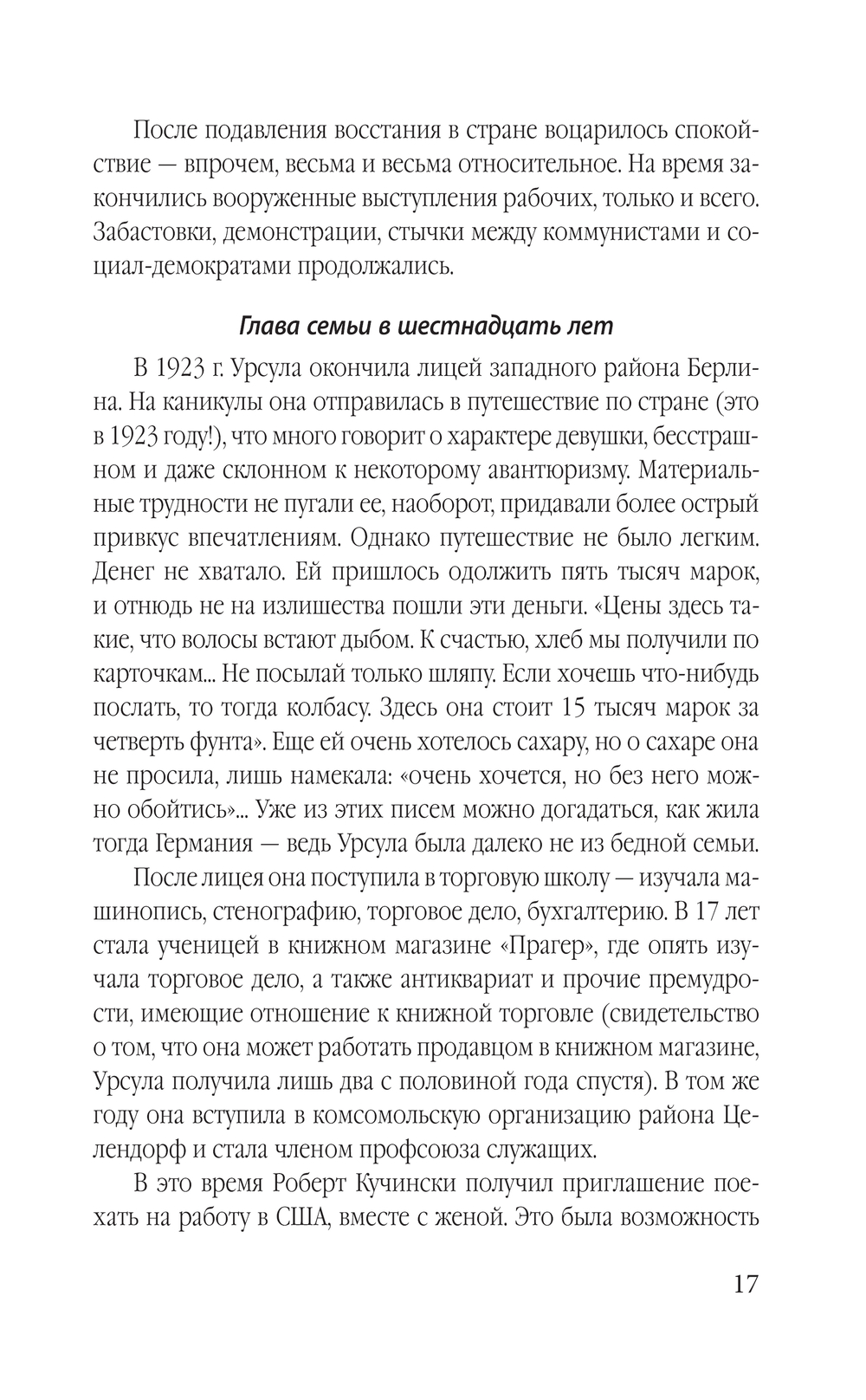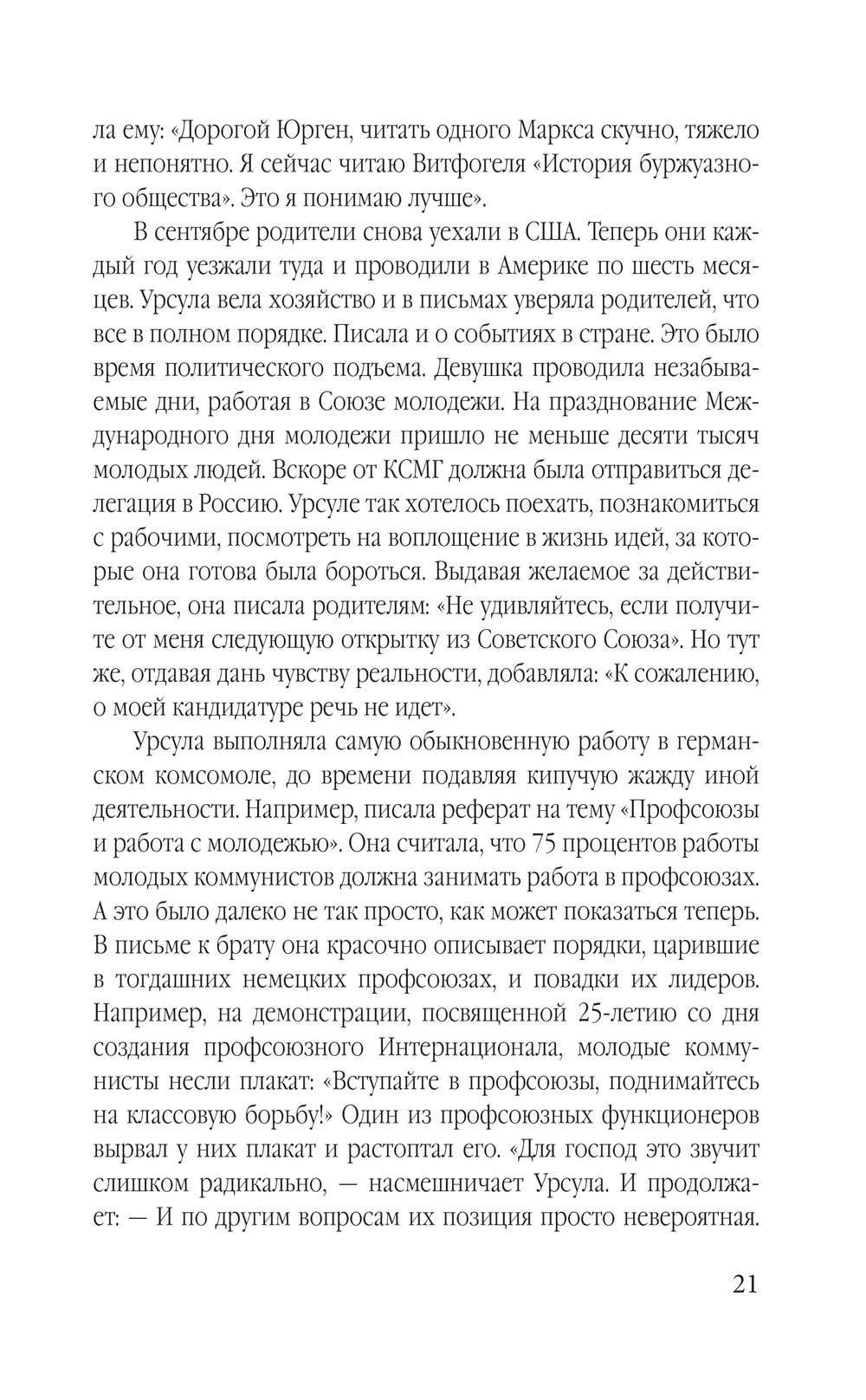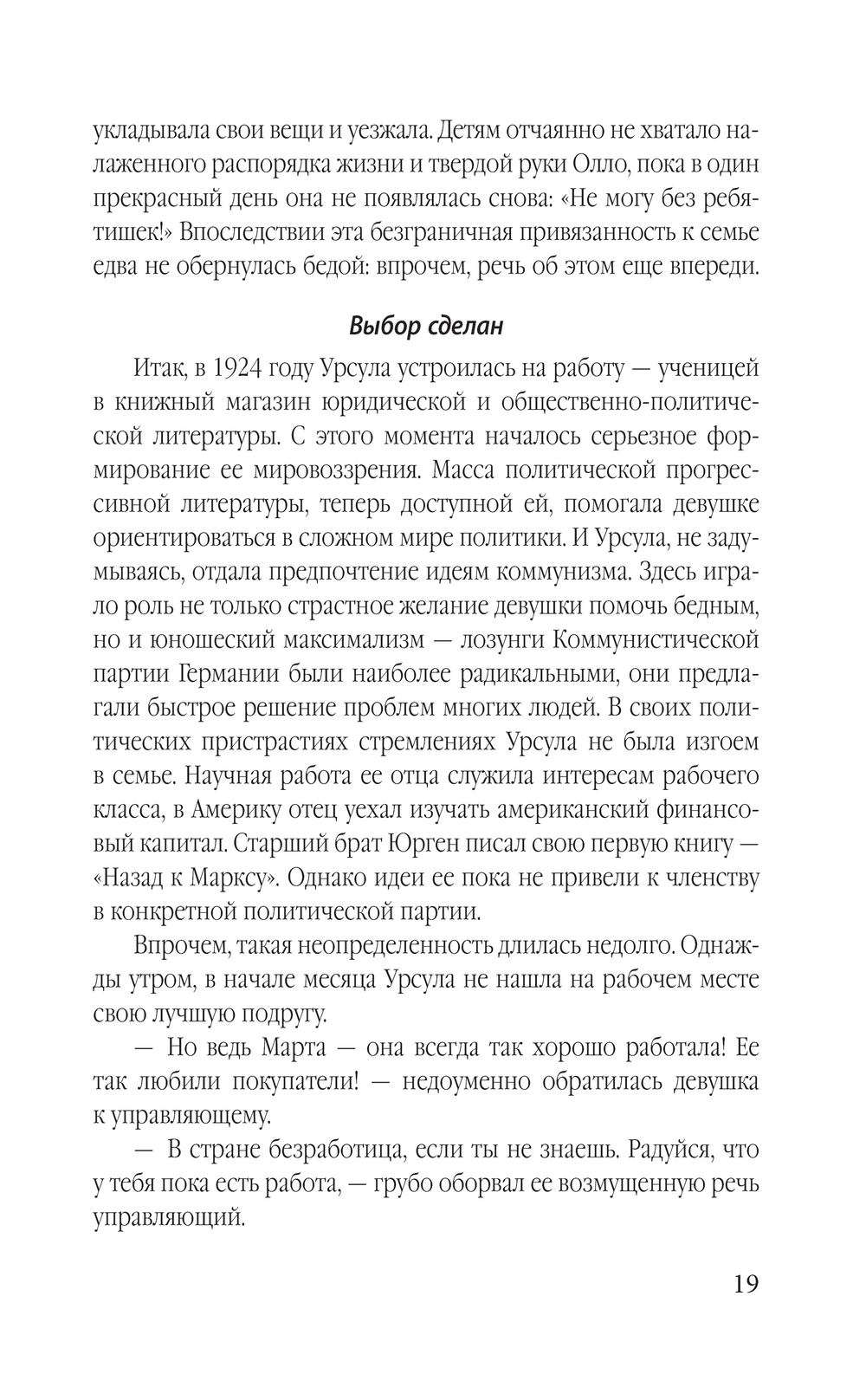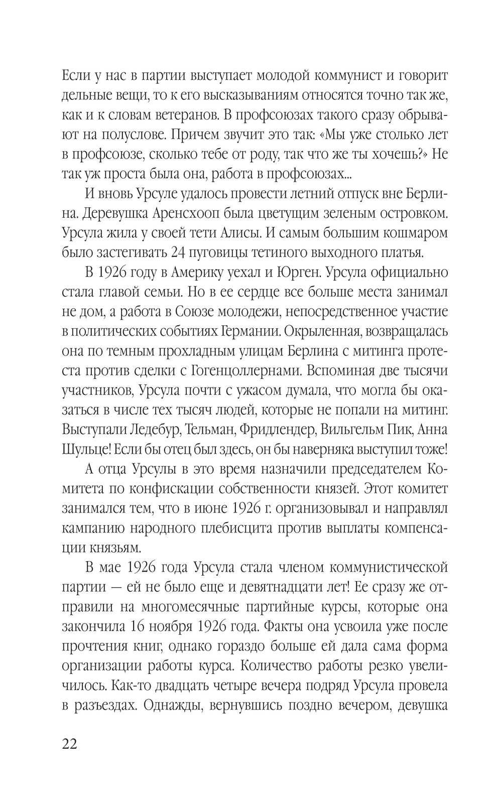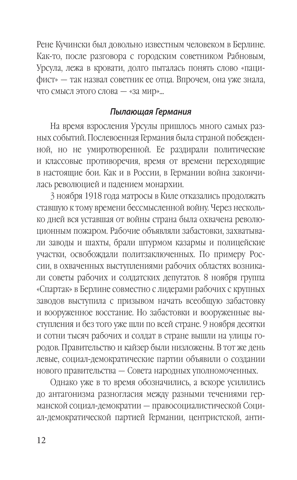 Биография крупнейшей советской разведчицы ХХ века, немки по национальности Рут Вернер, урождённой Урсулы Кучински, по мужьям Гамбургер и Бёртон. Нелегальная деятельность заставляла её менять мужей, страны и континенты, но до конца своей жизни она оставалась убеждённой коммунисткой и патриотом Советского Союза.