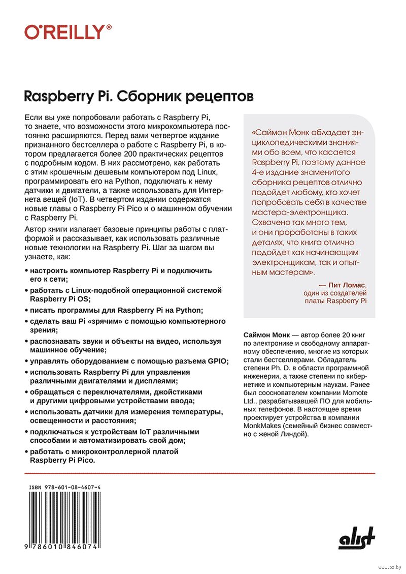 Книга содержит более 200 рецептов по работе с микрокомпьютером Raspberry Pi, рассматривающих как программные, так и аппаратные задачи. Показана установка и настройка операционной системы для Raspberry Pi, подключение датчиков и двигателей, способы интеграции Raspberry Pi в систему умного дома и сеть Интернета вещей. Рассмотрен язык Python в контексте программирования микроконтроллеров, разобраны продвинутые возможности Python, важные при создании сценариев и автоматизации процессов. В четвертом издании добавлены главы, рассказывающие о возможностях машинного обучения и о работе с уменьшенной версией платы – Raspberry Pi Pico.