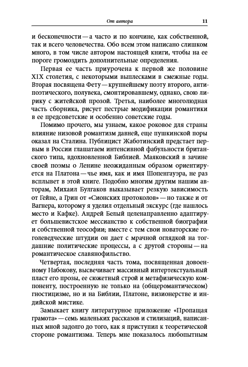 Его новая книга охватывает столетний период с конца романтического золотого века в 1840-х до 1940-х годов, когда катастрофы XX века оборвали жизни и литературные судьбы последних русских романтиков в широком диапазоне от Булгакова до Мандельштама.
