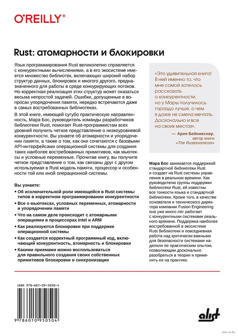 Книга позволяет программистам получить четкое представление о низкоуровневой конкурентности и ее реализации. Даны основы конкурентности в Rust. Раскрыты понятия об атомарности и упорядочении памяти. Рассмотрены практические аспекты создания своих собственных каналов, своего собственного типа Arc и своих собственных блокировок Дано представление о внутренней “кухне” процессора. Рассказано о примитивах операционной системы. Предложены идеи для самостоятельной разработки решений, связанных с вычислениями в конкурентном режиме.
