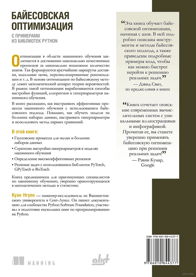 Книга рассказывает об оптимизации моделей машинного обучения на основе байесовского метода и теории вероятностей. Примеры составлены на языке Python с использованием библиотек PyTorch, GPyTorch и BoTorch. Описаны приёмы настройки гиперпараметров, гауссовское распределение, использование политик машинного обучения, в частности на основе задачи о многоруких бандитах, повышение производительности вычислений, многовариантная оптимизация с учётом полезности и затрат, а также применение байесовского метода в специализированных сценариях.
