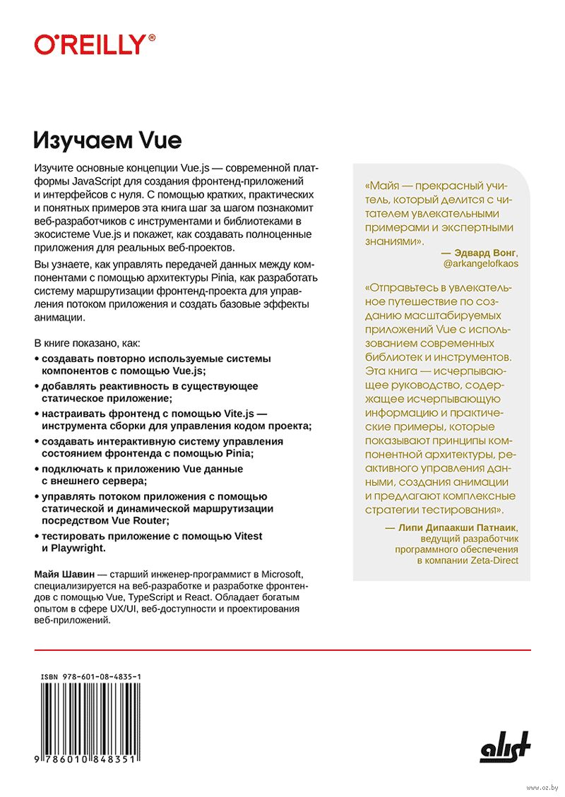 Книга посвящена созданию с нуля пользовательских интерфейсов и фронтенд-приложений с помощью Vue.js – современной платформы JavaScript. На практических примерах разработчики поэтапно познакомятся с инструментами и библиотеками экосистемы Vue.js и научатся создавать полноценные веб-приложения. Рассматриваются ключевые аспекты работы с Vue.js: создание компонентов, добавление реактивности, управление состоянием с помощью Pinia, настройка системы маршрутизации с использованием Vue Router, а также создание базовых анимационных эффектов. Подробно описана настройка фронтенда с помощью инструмента сборки для управления кодом Vite.js, создание повторно используемых компонентов, передача приложению данных с внешнего сервера, тестирование с использованием Vitest и Playwright. Показано, как управлять потоком приложения, реализовывать статическую и динамическую маршрутизацию, а также интегрировать Vue.js в существующие проекты.