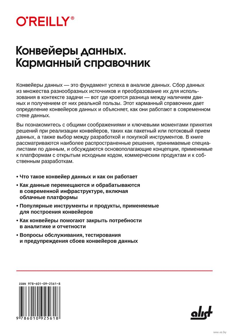 Книга посвящена передовым методам построения конвейеров данных, сбору данных из множества разнообразных источников и преобразованию их для аналитики. Дано введение в конвейеры данных, раскрыта их работа в современном стеке данных. Описаны стандартные шаблоны конвейеров данных. Показан процесс сбора данных от их извлечения до загрузки в хранилище. Затронуты вопросы преобразования и проверки данных, оркестровки конвейеров, методов их обслуживания и мониторинга производительности. Примеры программ написаны на Python и SQL и задействуют множество библиотек с открытым исходным кодом.