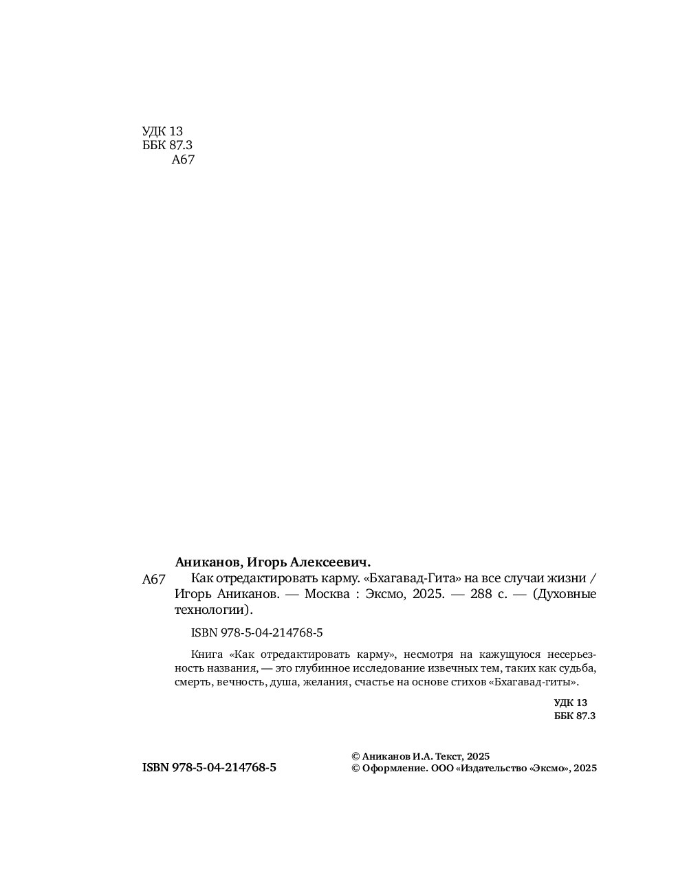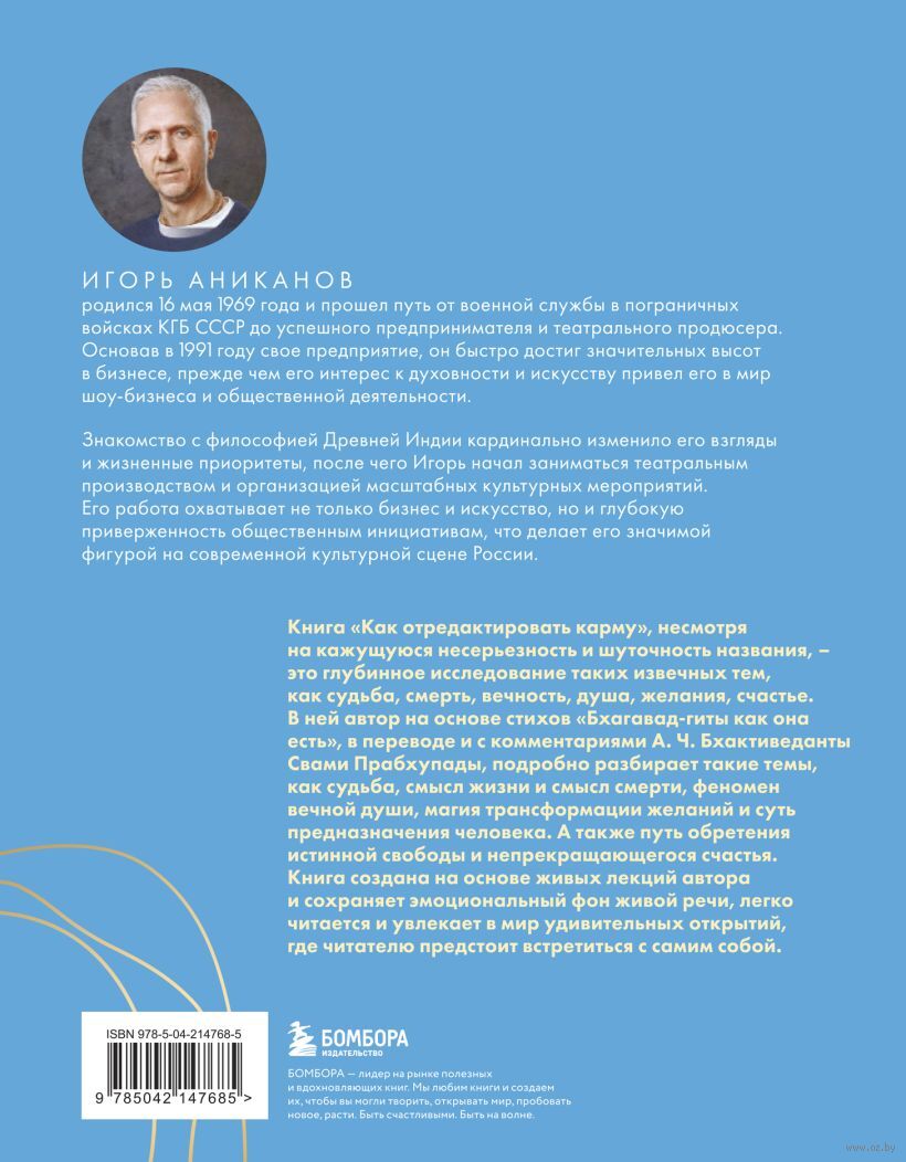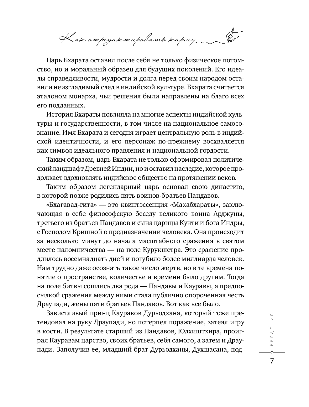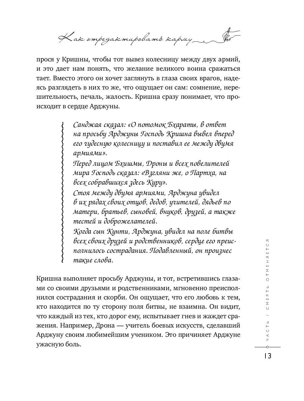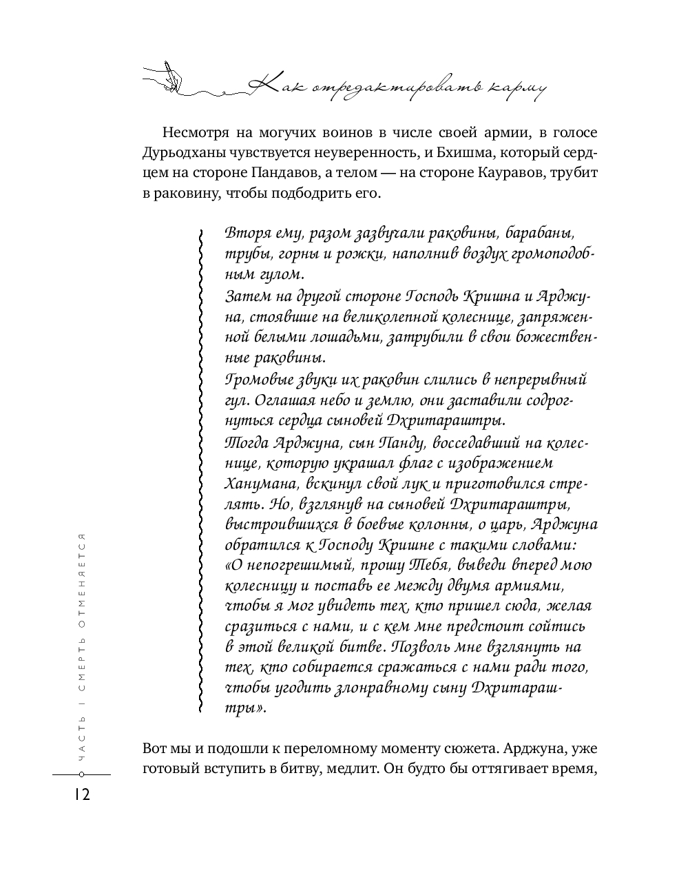 Книга "Как отредактировать карму", несмотря на кажущуюся несерьезность названия, – это глубинное исследование извечных тем, таких как судьба, смерть, вечность, душа, желания, счастье на основе стихов "Бхагавад-гиты".