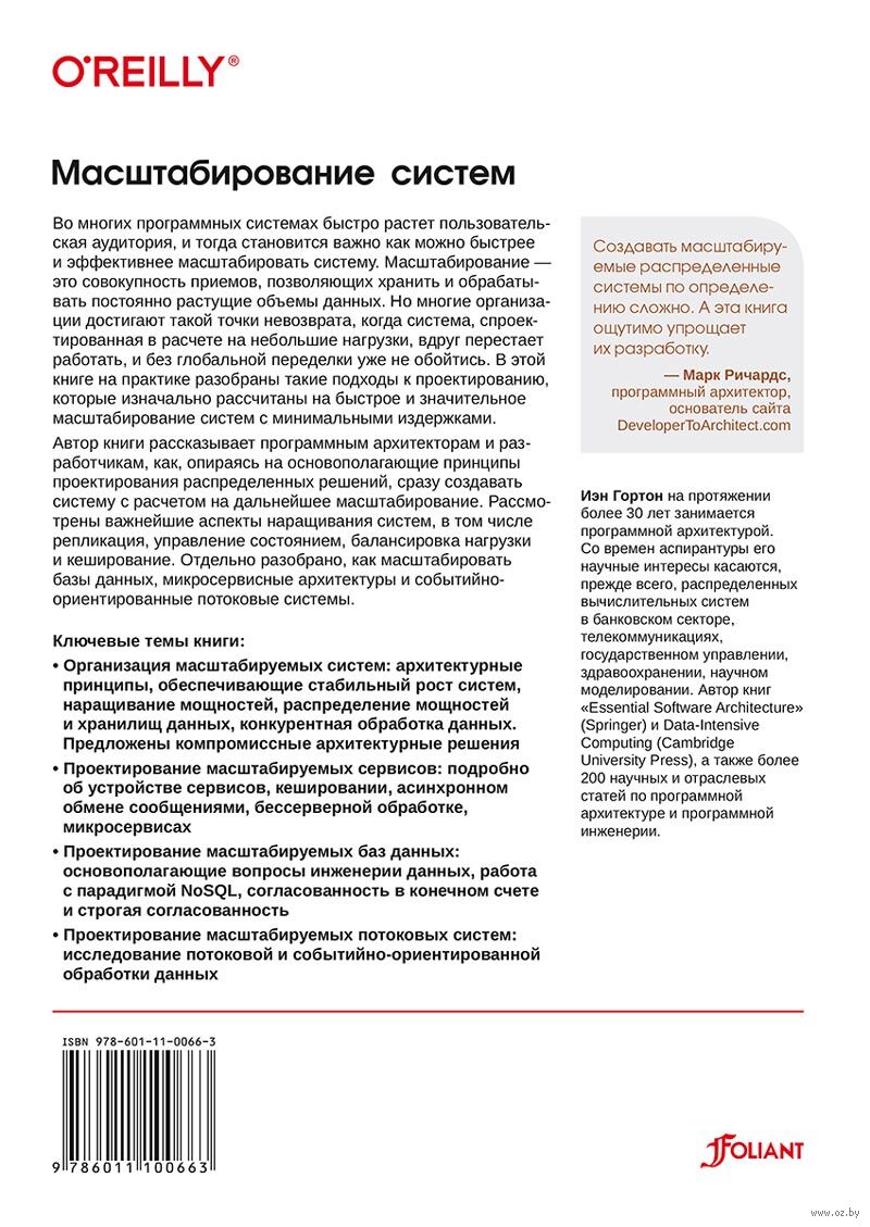 Книга посвящена проектированию и последующему масштабированию сложных распределенных систем. В качестве конкретных примеров разобраны различные аспекты баз данных, микросервисов, событийно-ориентированных и потоковых систем. Уделено внимание NoSQL-подходу к проектированию баз данных, бессерверным вычислениям. Затронуты приемы обеспечения согласованности и репликации данных, в том числе при конкурентной обработке. Описываемые приемы рассчитаны, прежде всего, на быстрый рост объемов данных и на постепенное увеличение вычислительных мощностей и пропускной способности всей системы.