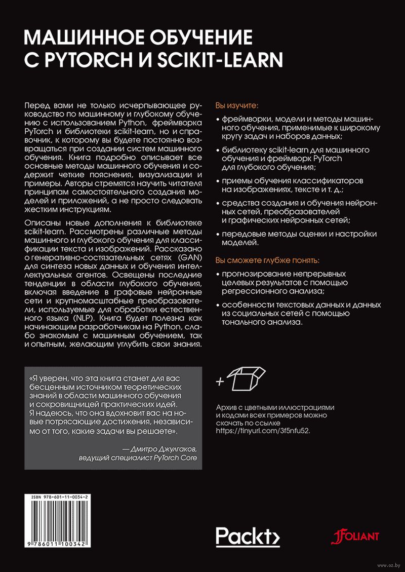 Исчерпывающее руководство по машинному (МО) и глубокому обучению с использованием языка программирования Python, фреймворка PyTorch и библиотеки scikit-learn. Рассмотрены основы МО, алгоритмы для задач классификации, классификаторы на основе scikit-learn, предварительная обработка и сжатие данных, современные методы оценки моделей и объединение различных моделей для ансамблевого обучения. Рассказано о применении МО для анализа текста и прогнозировании непрерывных целевых переменных с помощью регрессионного анализа, кластерном анализе и обучении без учителя, показано построение многослойной искусственной нейронной сети с нуля. Раскрыты продвинутые возможности PyTorch для решения сложных задач. Описано применение глубоких сверточных и рекуррентных нейронных сетей, трансформеров, генеративных состязательных и графовых нейронных сетей, Особое внимание уделено обучению с подкреплением для систем принятия решений в сложных средах. Электронный архив содержит цветные иллюстрации и коды всех примеров.