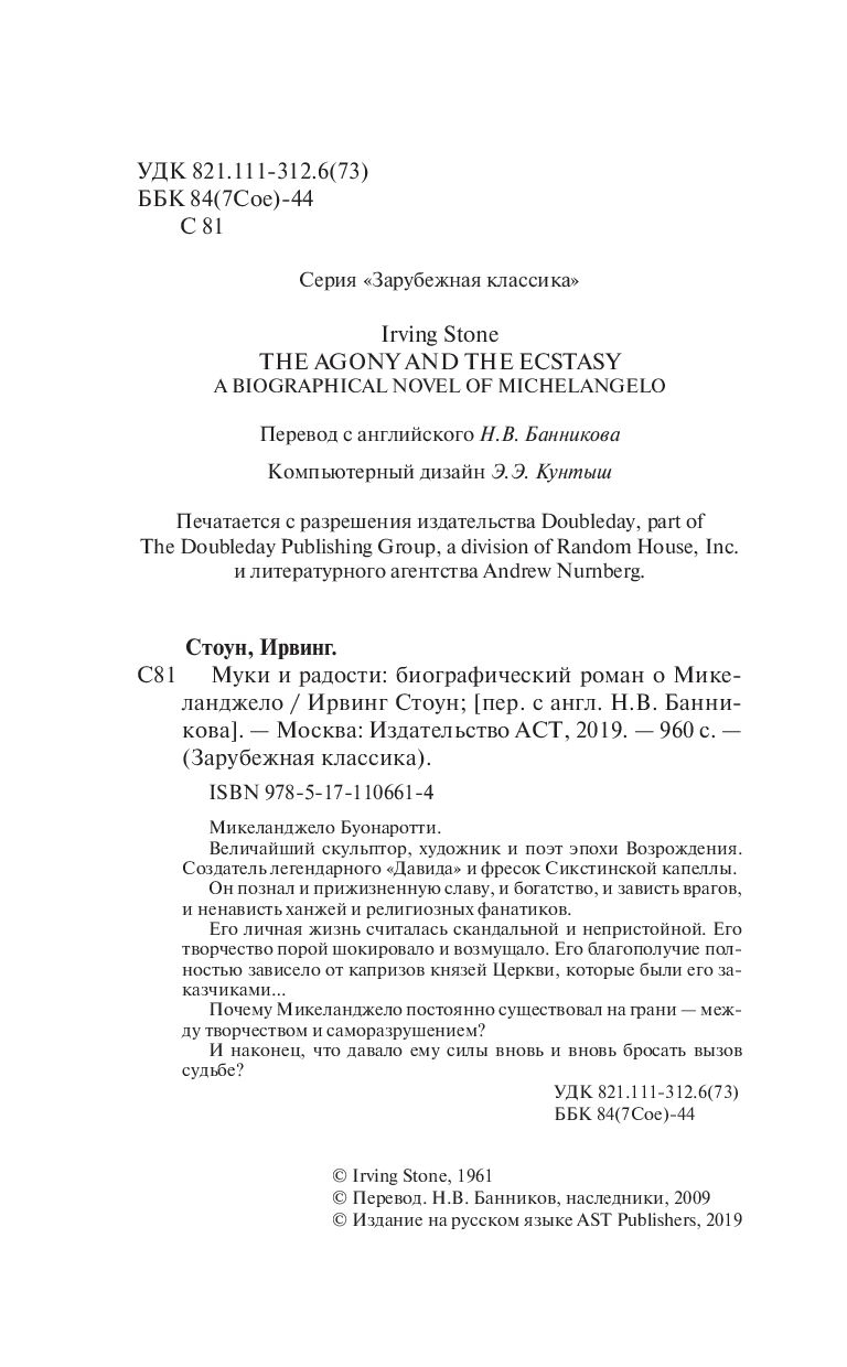 | Название в оригинале | The Agony and the Ecstasy: A Biographical Novel of Michelangelo |
