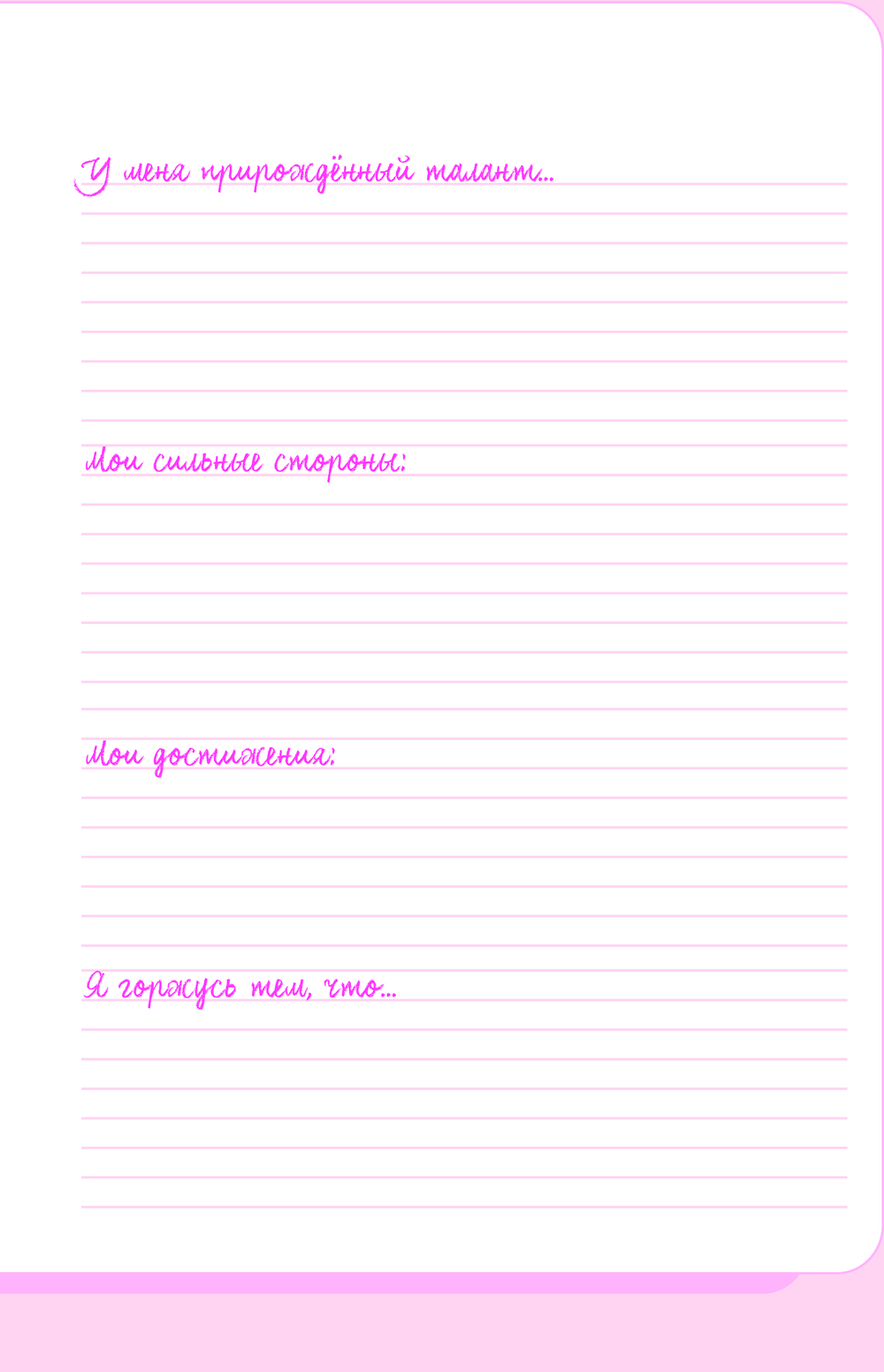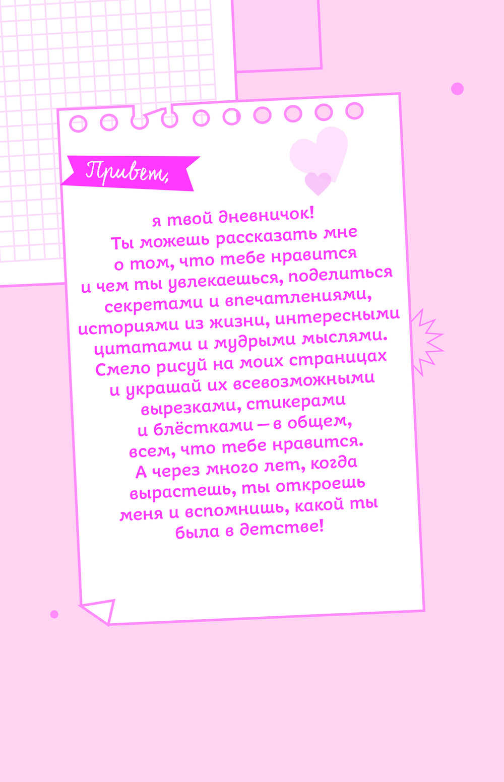 Под стильной обложкой тебя ждёт множество интересных рубрик. Дневник станет отличным подарком для девочки младшего и среднего школьного возраста. А качественные материалы, из которых он выполнен, позволят сохранить записанное в него на долгие годы.