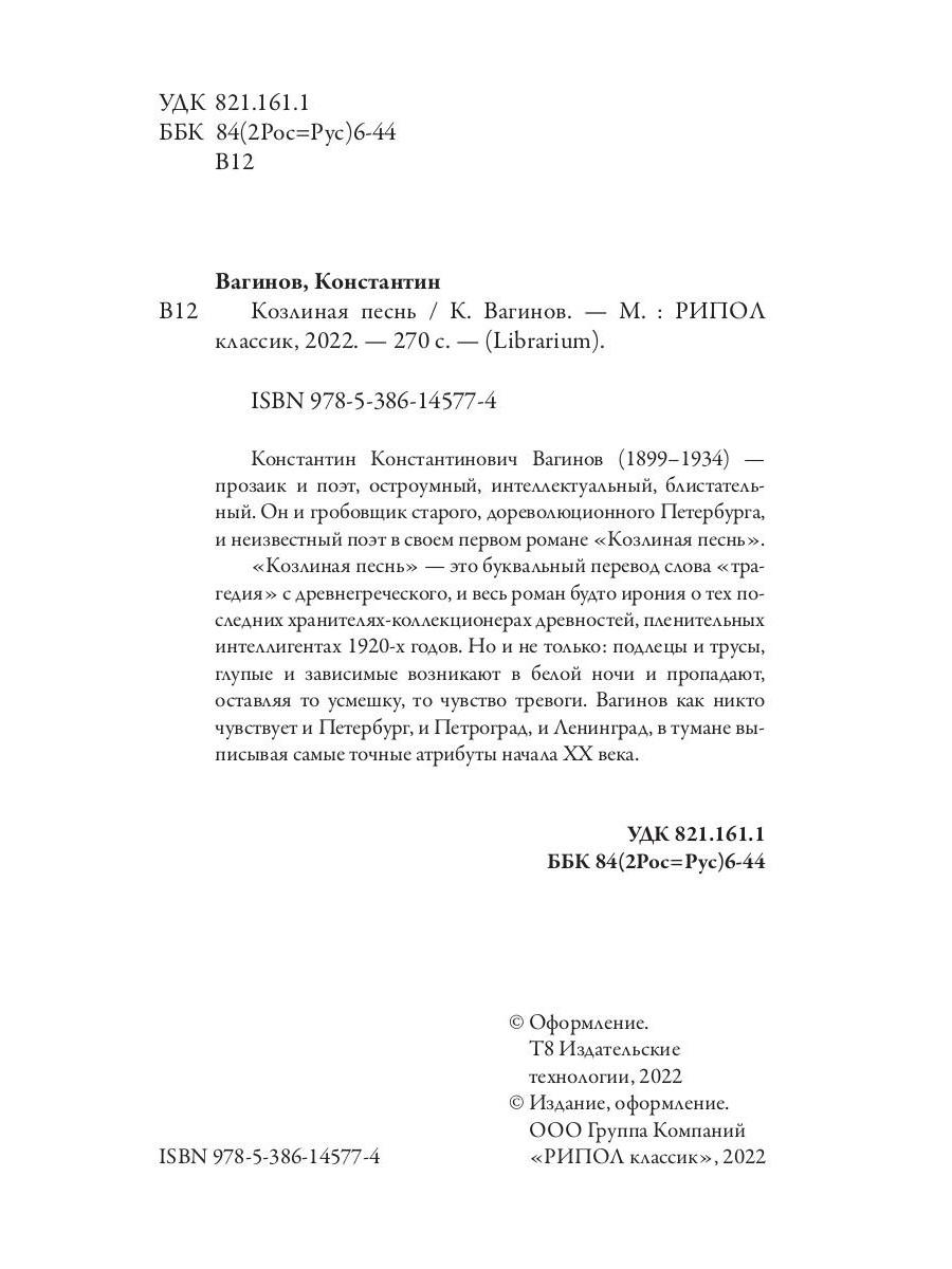 "Козлиная песнь" – это буквальный перевод слова "трагедия" с древнегреческого, и весь роман будто ирония о тех последних хранителях-коллекционерах древностей, пленительных интеллигентах 1920-х годов. Но и не только: подлецы и трусы, глупые и зависимые возникают в белой ночи и пропадают, оставляя то усмешку, то чувство тревоги. К. Вагинов как никто чувствует и Петербург, и Петроград, и Ленинград, в тумане выписывая самые точные атрибуты начала XX века.