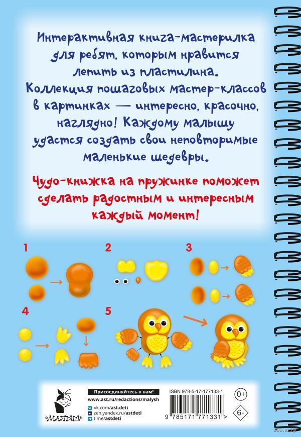 "Лепим из пластилина. Шаг за шагом: смотри и повторяй" – коллекция мастер-классов, которые помогут детям легко освоить искусство лепки. Крупные и красочные пошаговые иллюстрации понятны даже маленькому ребёнку. Как слепить милого котика, забавную черепашку, весёлую овечку, красавицу-сову, Змея Горыныча и другие поделки – на красочных страницах. Занимаясь лепкой с замечательной книжкой, малыш разовьёт мелкую моторику и воображение, подготовит руку к письму. А родители смогут помочь ребёнку в творческом начинании.