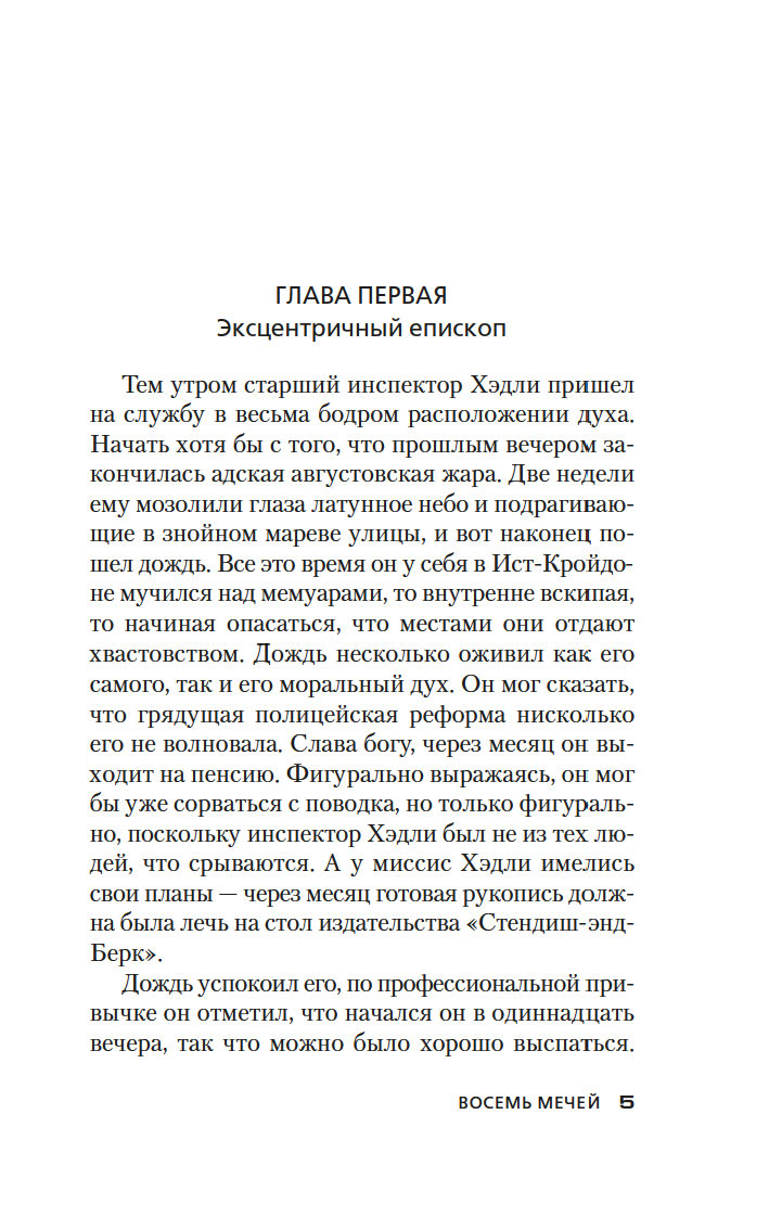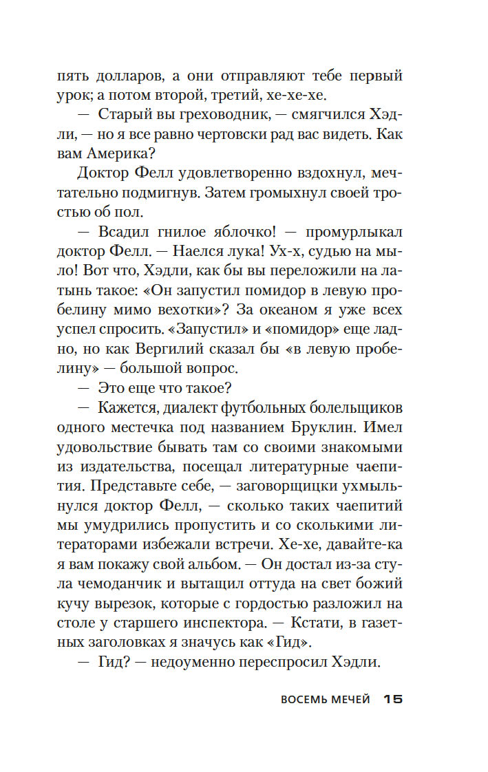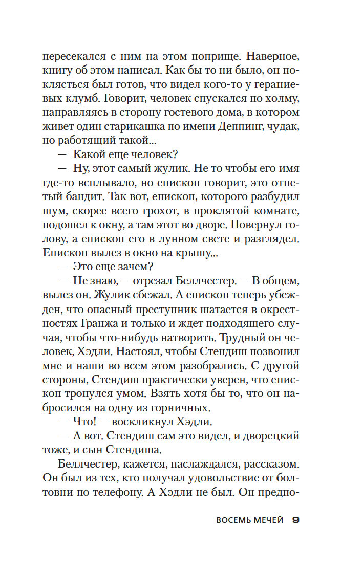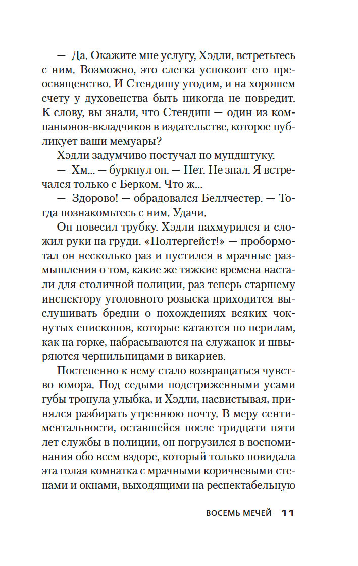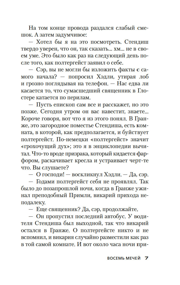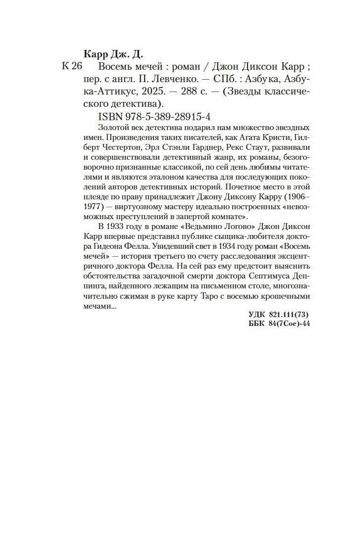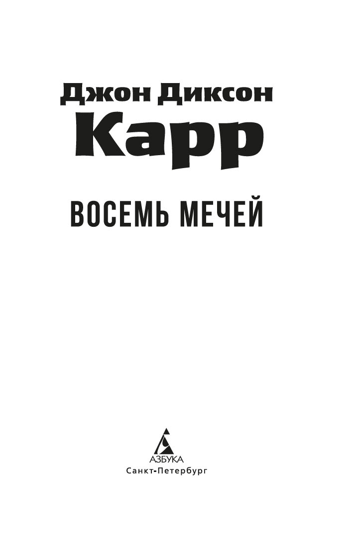 В 1933 году в романе "Ведьмино Логово" Джон Диксон Карр впервые представил публике сыщика-любителя доктора Гидеона Фелла. Увидевший свет в 1934 году роман "Восемь мечей" – история третьего по счету расследования эксцентричного доктора Фелла. На сей раз ему предстоит выяснить обстоятельства загадочной смерти доктора Септимуса Деппинга, найденного лежащим на письменном столе, многозначительно сжимая в руке карту Таро с восемью крошечными мечами...