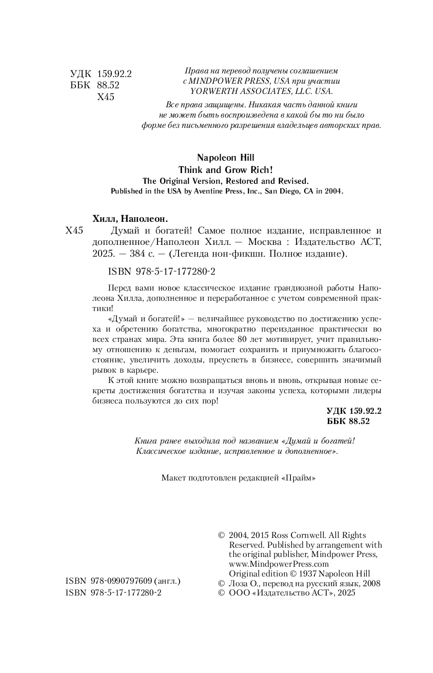 "Думай и богатей!" – величайшее руководство по достижению успеха и обретению богатства, многократно переизданное практически во всех странах мира. Эта книга более 80 лет мотивирует, учит правильному отношению к деньгам, помогает сохранить и приумножить благосостояние, увеличить доходы, преуспеть в бизнесе, совершить значимый рывок в карьере.