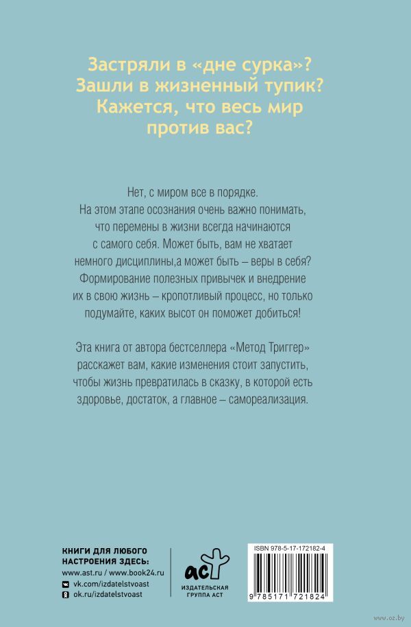 Нет, с миром все в порядке. На этом этапе осознания очень важно понимать, что перемены в жизни всегда начинаются с самого себя. Может быть, вам не хватает немного дисциплины,а может быть – веры в себя? Формирование полезных привычек и внедрение их в свою жизнь – кропотливый процесс, но только подумайте, каких высот он поможет добиться! Эта книга от автора бестселлера "Метод Триггер" расскажет вам, какие изменения стоит запустить, чтобы жизнь превратилась в сказку, в которой есть здоровье, достаток, а главное – самореализация.