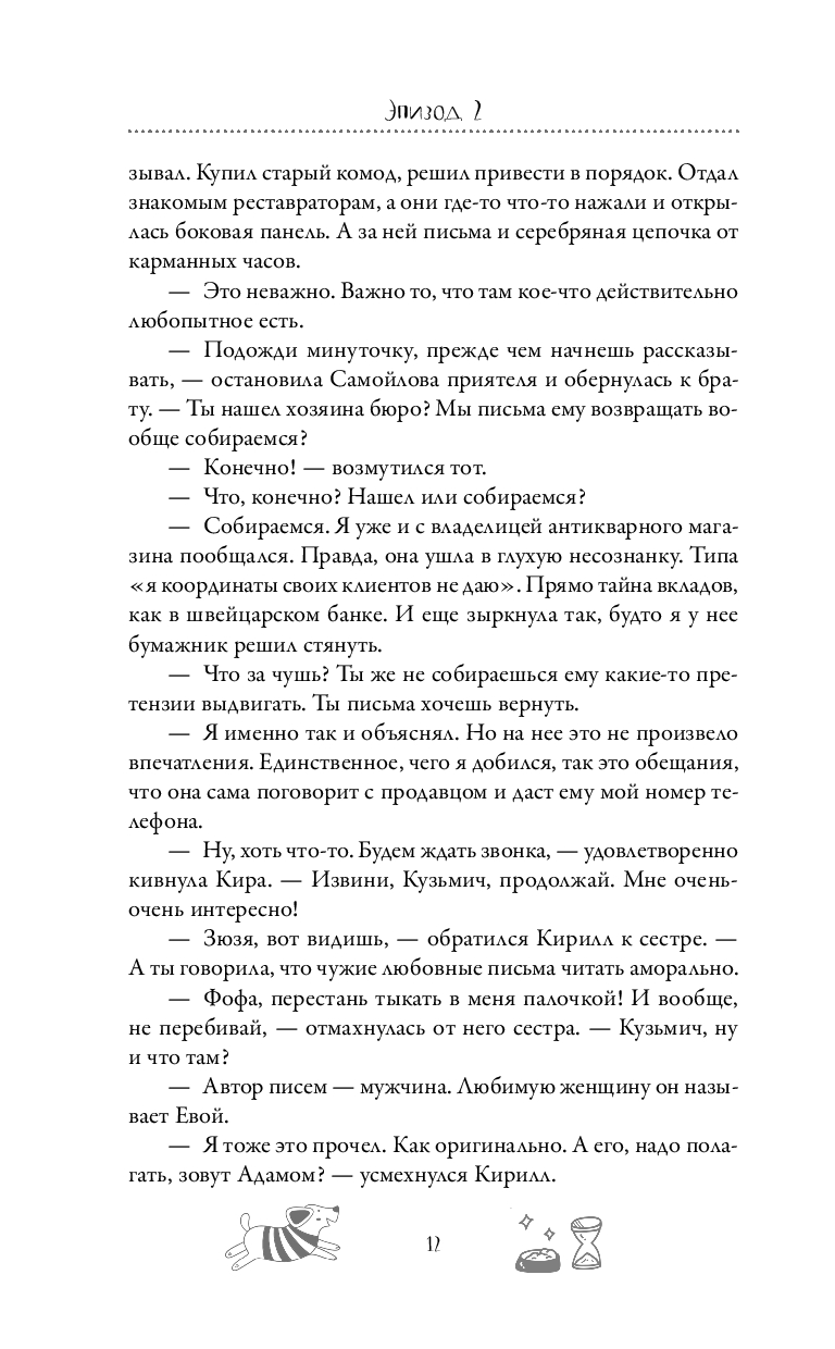 Приключения неразлучной троицы – Киры, Кирилла и Кузьмича – продолжаются. На этот раз в тайнике старинного бюро Кирилл находит пачку писем столетней давности, в которых упоминаются спрятанные сокровища. Он приезжает в антикварный салон, где купил бюро, чтобы выяснить адрес прежнего владельца мебели. Но не успел Кирилл уйти, как хозяйка салона была обнаружена мертвой. Самое неприятное, что он становится одним из подозреваемых в ее убийстве. Деваться некуда – теперь друзьям предстоит выяснить, связана ли смерть владелицы салона с письмами или нет, а также кто совершил это преступление. И, разумеется, постараться найти старинный клад…