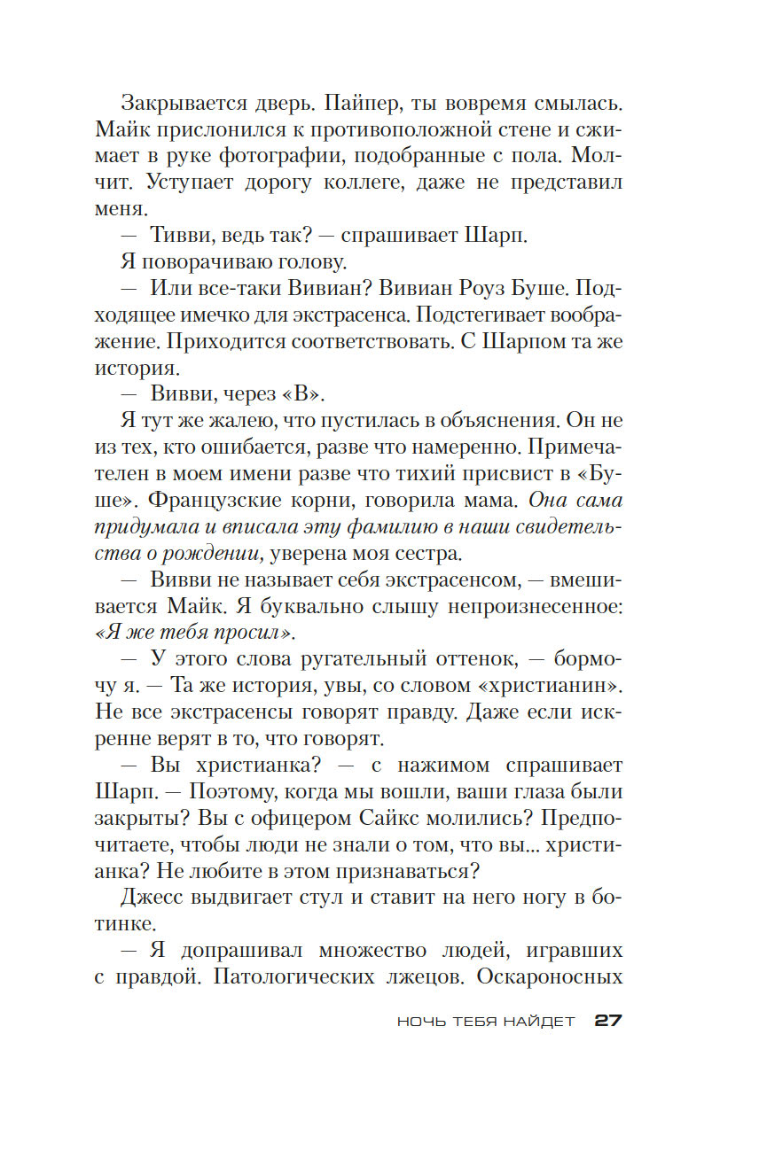 Когда ей было десять лет, Вивиан Роуз Буше сделала невозможное предсказание – и спасла чужую жизнь. Спасенный мальчик – Майк – вырос и стал полицейским, а Вивиан – астрофизиком, возможно обнаружившим свидетельство того, что мы не одни во Вселенной. Но Майк верит и в паранормальные таланты Вивиан – и просит ее помочь в поисках маленькой девочки, десять лет назад бесследно пропавшей из викторианского особняка. Неразгаданная загадка будоражит и родных девочки, и самых безбашенных конспирологов…
