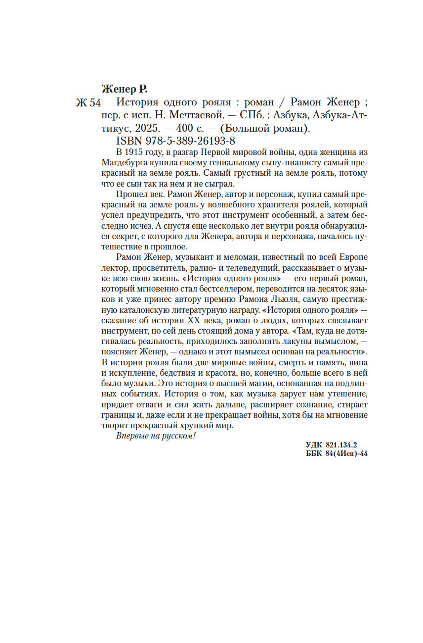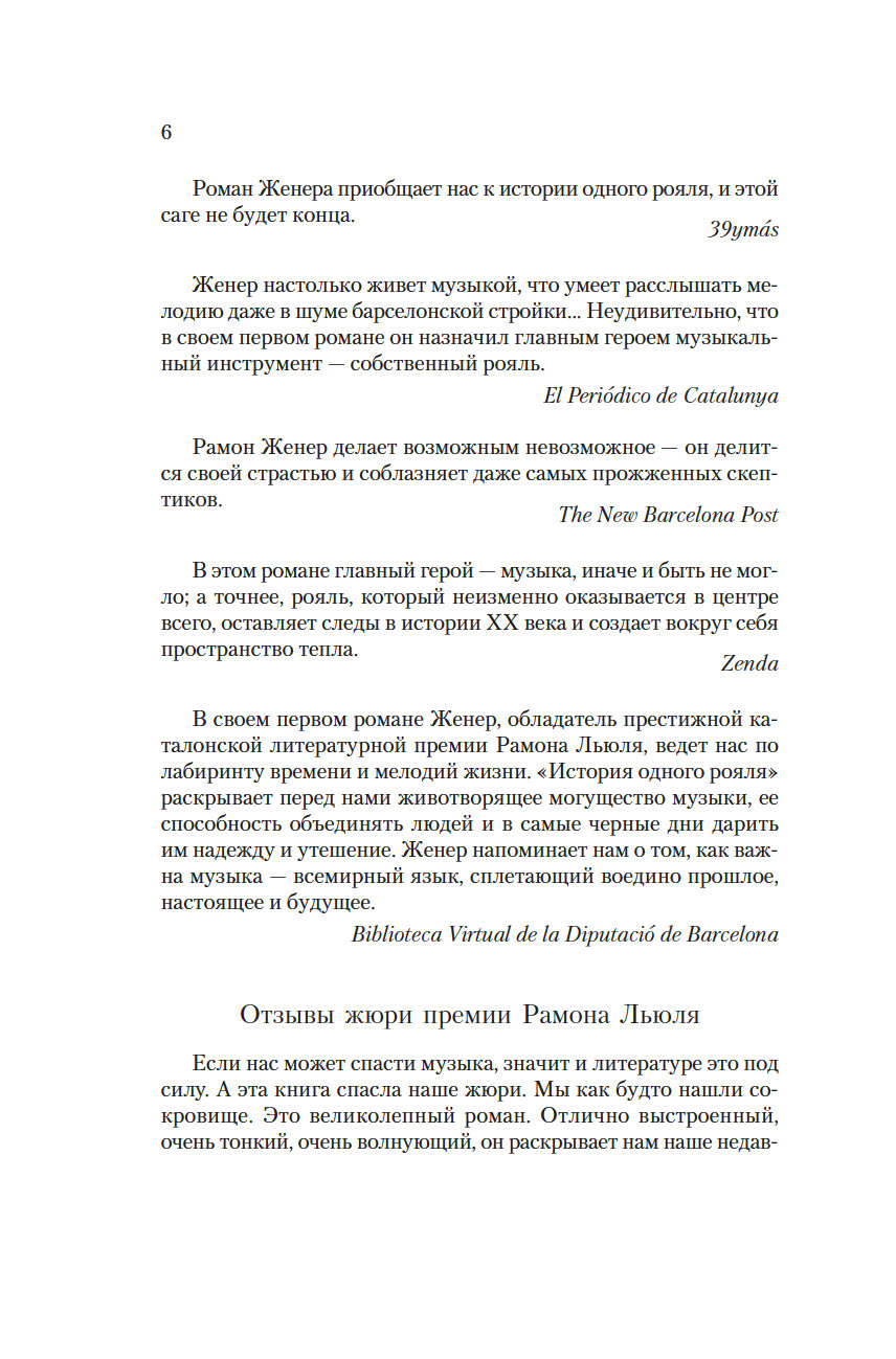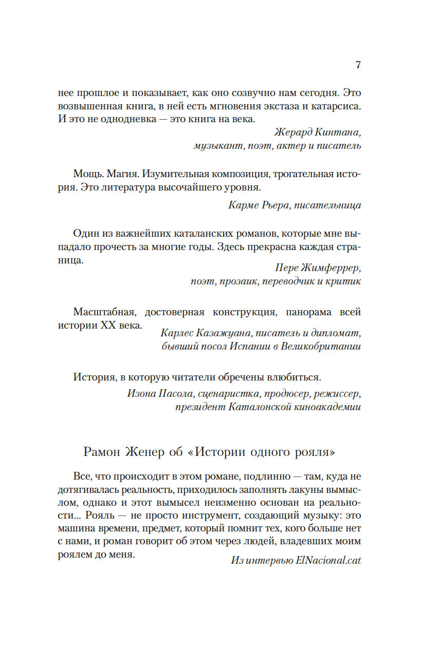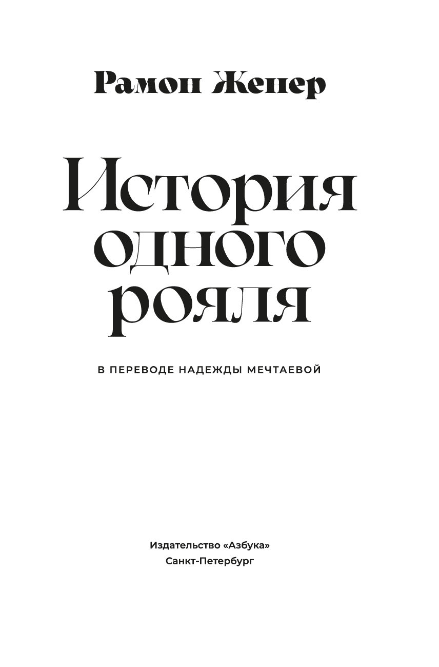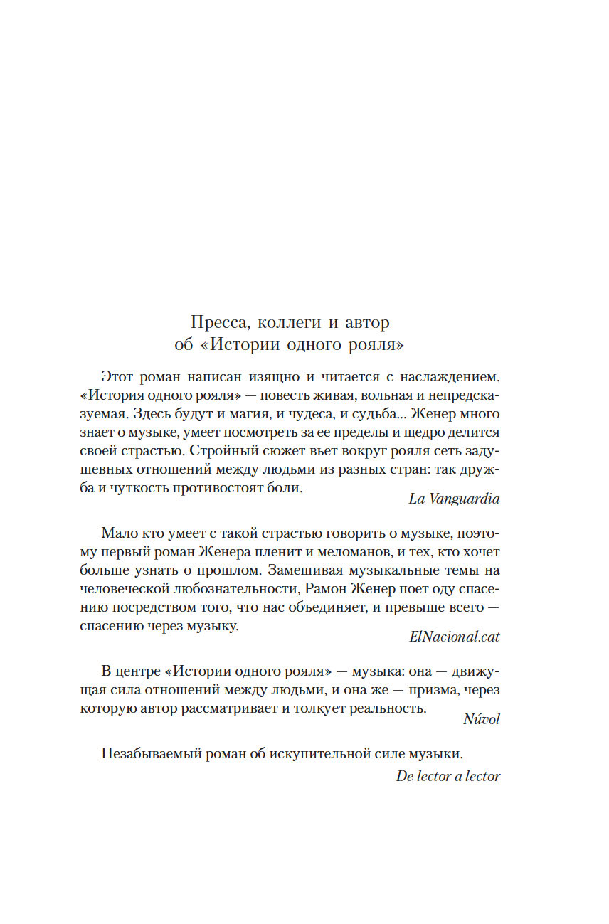 Рамон Женер, музыкант и меломан, известный по всей Европе лектор, просветитель, радио- и телеведущий, рассказывает о музыке всю свою жизнь. "История одного рояля" – его первый роман, который мгновенно стал бестселлером, переводится на десяток языков и уже принес автору премию Рамона Льюля, самую престижную каталонскую литературную награду. "История одного рояля" – сказание об истории ХХ века, роман о людях, которых связывает инструмент, по сей день стоящий дома у автора. "Там, куда не дотягивалась реальность, приходилось заполнять лакуны вымыслом, – поясняет Женер, – однако и этот вымысел основан на реальности". В истории рояля были две мировые войны, смерть и память, вина и искупление, бедствия и красота, но, конечно, больше всего в ней было музыки. Это история о высшей магии, основанная на подлинных событиях. История о том, как музыка дарует нам утешение, придает отваги и сил жить дальше, расширяет сознание, стирает границы и, даже если и не прекращает войны, хотя бы на мгновение творит прекрасный хрупкий мир.