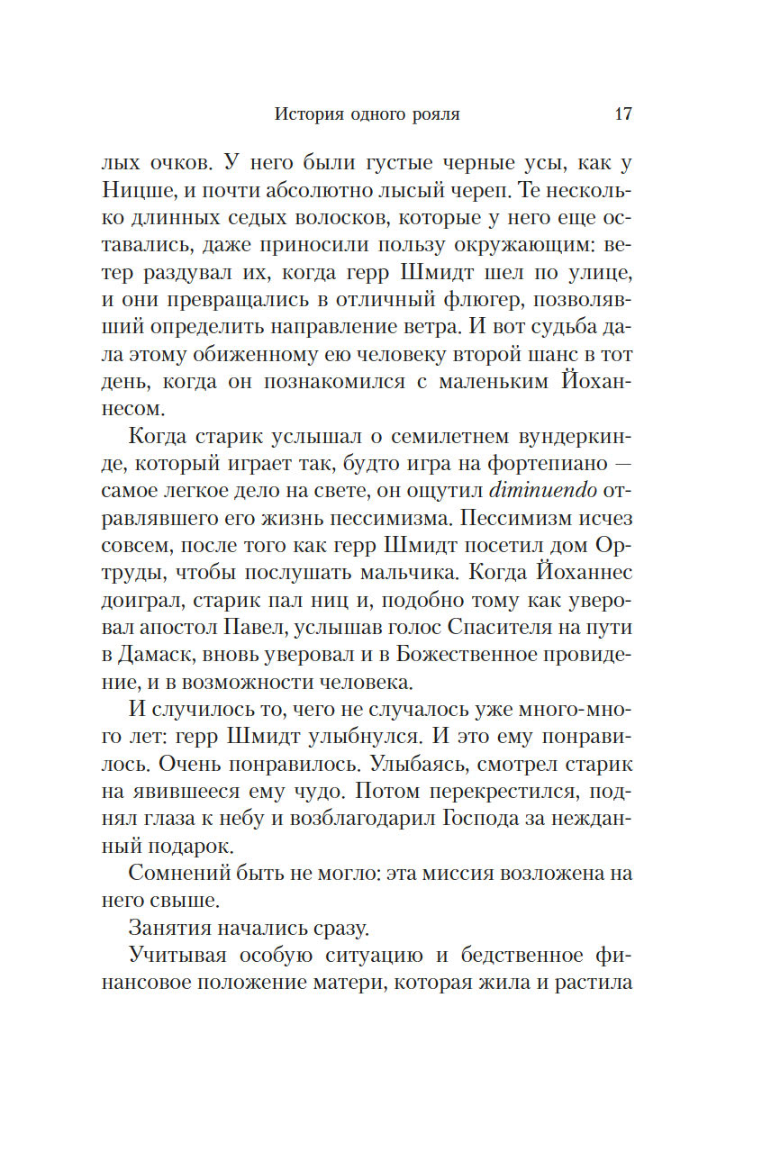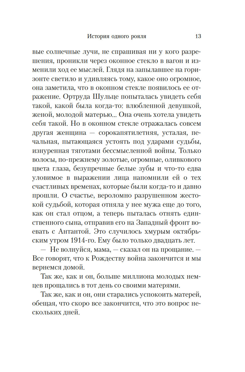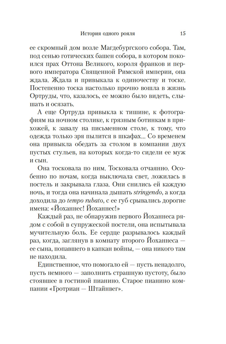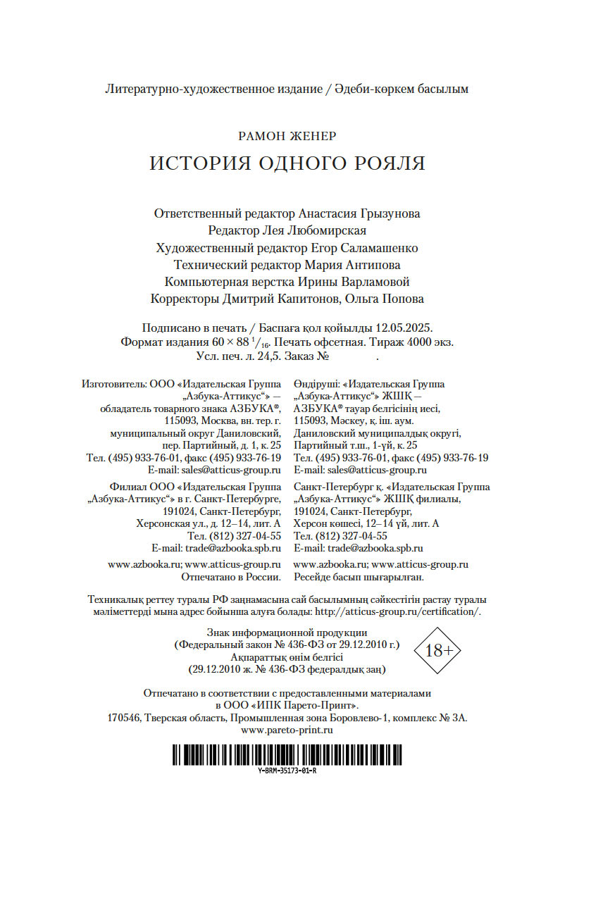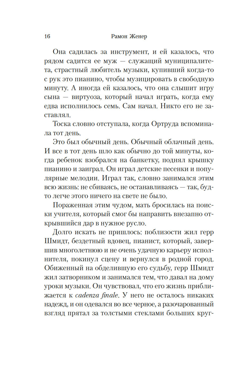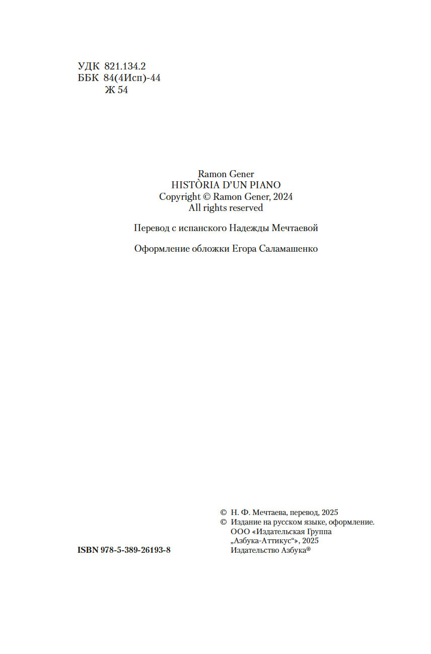 Рамон Женер, музыкант и меломан, известный по всей Европе лектор, просветитель, радио- и телеведущий, рассказывает о музыке всю свою жизнь. "История одного рояля" – его первый роман, который мгновенно стал бестселлером, переводится на десяток языков и уже принес автору премию Рамона Льюля, самую престижную каталонскую литературную награду. "История одного рояля" – сказание об истории ХХ века, роман о людях, которых связывает инструмент, по сей день стоящий дома у автора. "Там, куда не дотягивалась реальность, приходилось заполнять лакуны вымыслом, – поясняет Женер, – однако и этот вымысел основан на реальности". В истории рояля были две мировые войны, смерть и память, вина и искупление, бедствия и красота, но, конечно, больше всего в ней было музыки. Это история о высшей магии, основанная на подлинных событиях. История о том, как музыка дарует нам утешение, придает отваги и сил жить дальше, расширяет сознание, стирает границы и, даже если и не прекращает войны, хотя бы на мгновение творит прекрасный хрупкий мир.